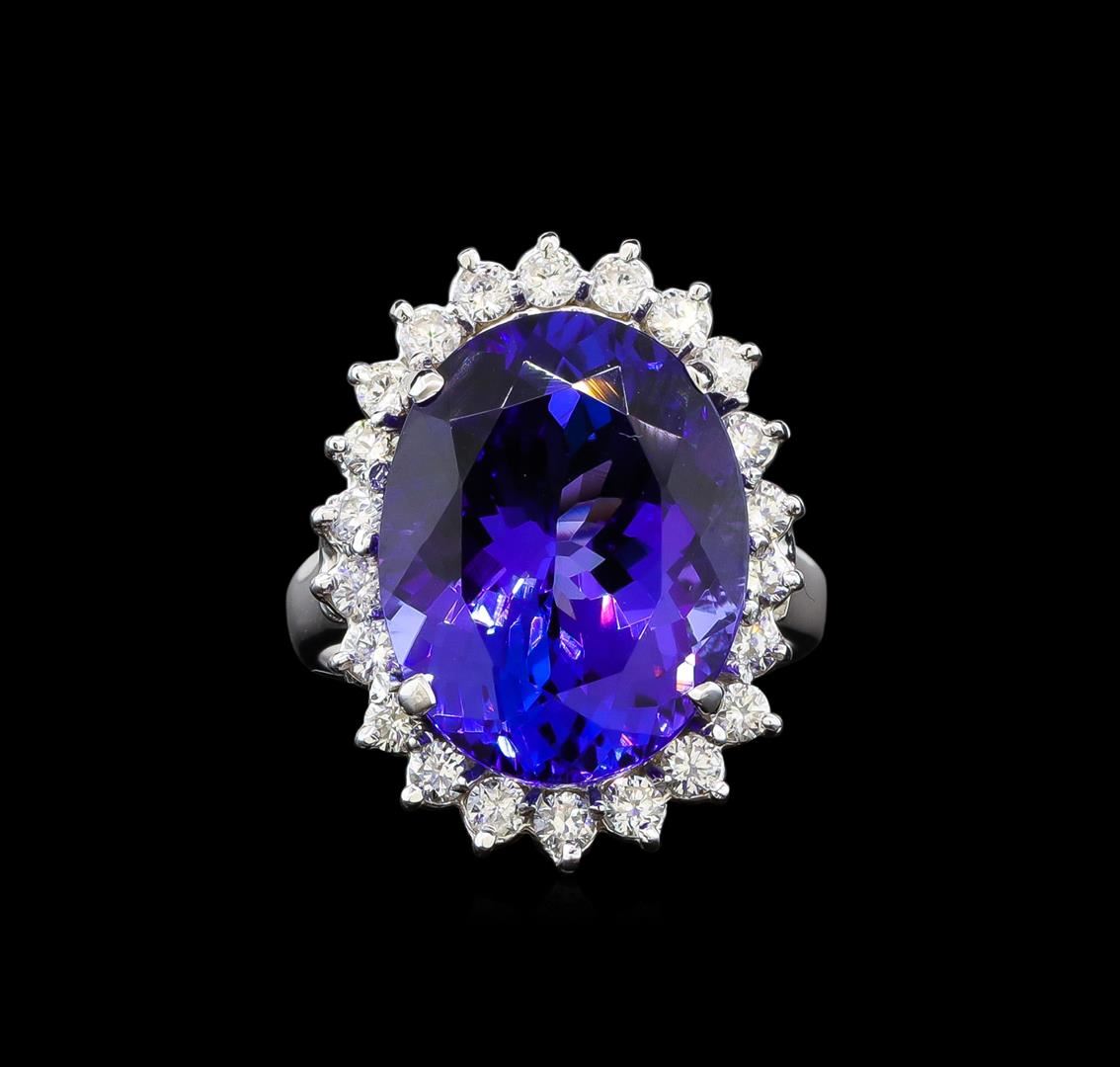 One electronically tested 14KT white gold lady's cast fashion ring with a basket halo with a bright polish finish. The featured lady's ring has a shank measuring 2.75 millimeters wide. Identified with markings of '14K'. Condition is new, good workmanship. Containing: One prong set oval modified brilliant cut natural tanzanite, measuring 16.19 x 12.51 x 8.39mm, (depth est.) approximate weight of 11.40ct., clarity is eye clean, medium dark, strong, violet color, (GIA V 6/5), cut is very good. Transmitting light with no distortion, transparent. Colored gemstones are presumed to have been subjected to commonly used enhancement processes. Graded loose prior to setting in the GIA Laboratory, Report #2171665709. Twenty-Two prong set round brilliant cut diamonds, measuring 2.30 - 2.25 x 1.41mm (depth est.) approximate total weight of 22 Stones = 0.98ct. Graded in the setting. Clarity SI-1 to I-1. Color: H - I Cut Good. Total Weight of Colored Stones 11.40ct.. Total Weight of Diamonds 0.98ct.. Total Weight of Ring 8.50gm. GAS Appraised at $19,915.00.
