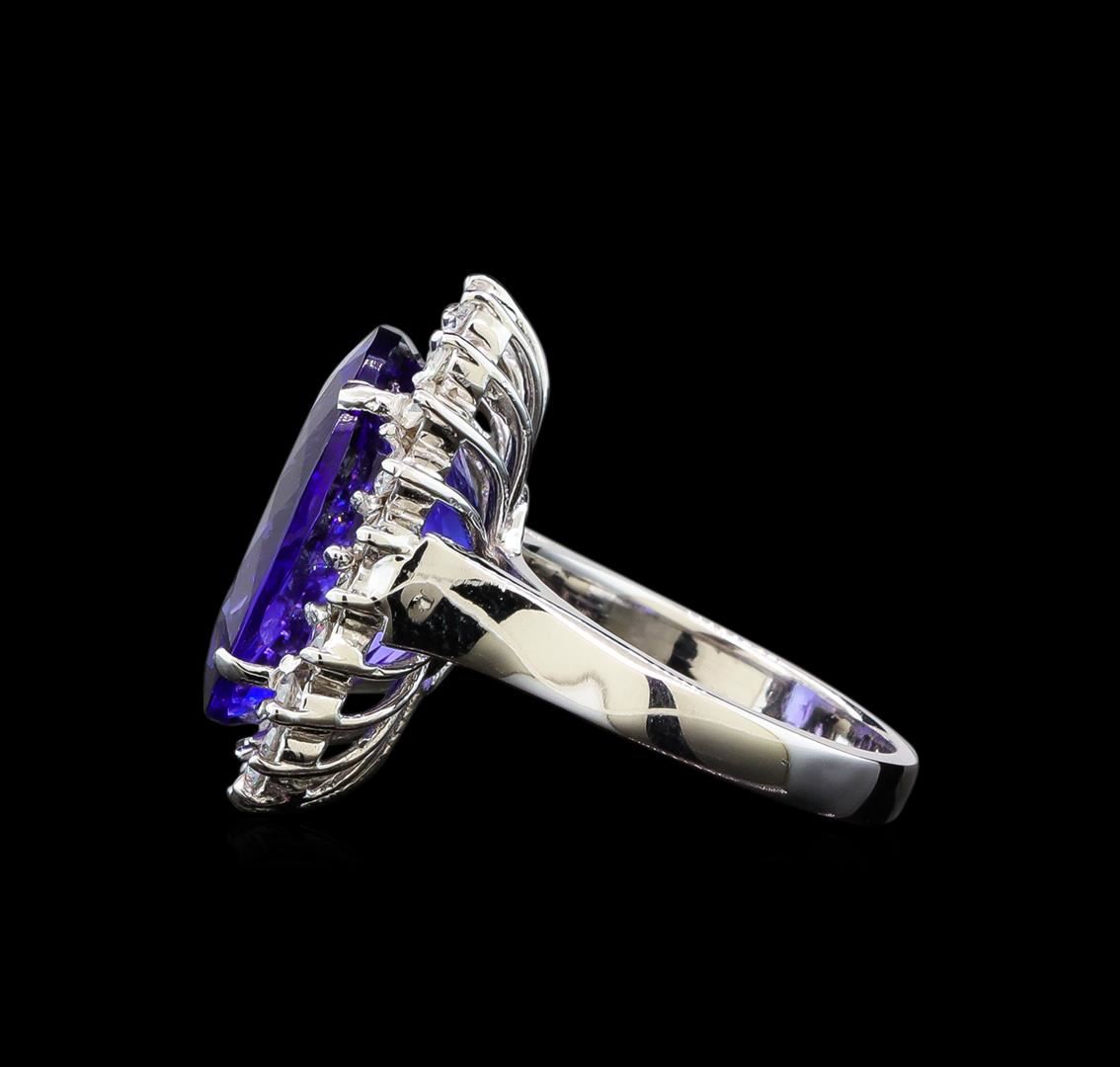 One electronically tested 14KT white gold lady's cast fashion ring with a basket halo with a bright polish finish. The featured lady's ring has a shank measuring 2.75 millimeters wide. Identified with markings of '14K'. Condition is new, good workmanship. Containing: One prong set oval modified brilliant cut natural tanzanite, measuring 16.19 x 12.51 x 8.39mm, (depth est.) approximate weight of 11.40ct., clarity is eye clean, medium dark, strong, violet color, (GIA V 6/5), cut is very good. Transmitting light with no distortion, transparent. Colored gemstones are presumed to have been subjected to commonly used enhancement processes. Graded loose prior to setting in the GIA Laboratory, Report #2171665709. Twenty-Two prong set round brilliant cut diamonds, measuring 2.30 - 2.25 x 1.41mm (depth est.) approximate total weight of 22 Stones = 0.98ct. Graded in the setting. Clarity SI-1 to I-1. Color: H - I Cut Good. Total Weight of Colored Stones 11.40ct.. Total Weight of Diamonds 0.98ct.. Total Weight of Ring 8.50gm. GAS Appraised at $19,915.00.