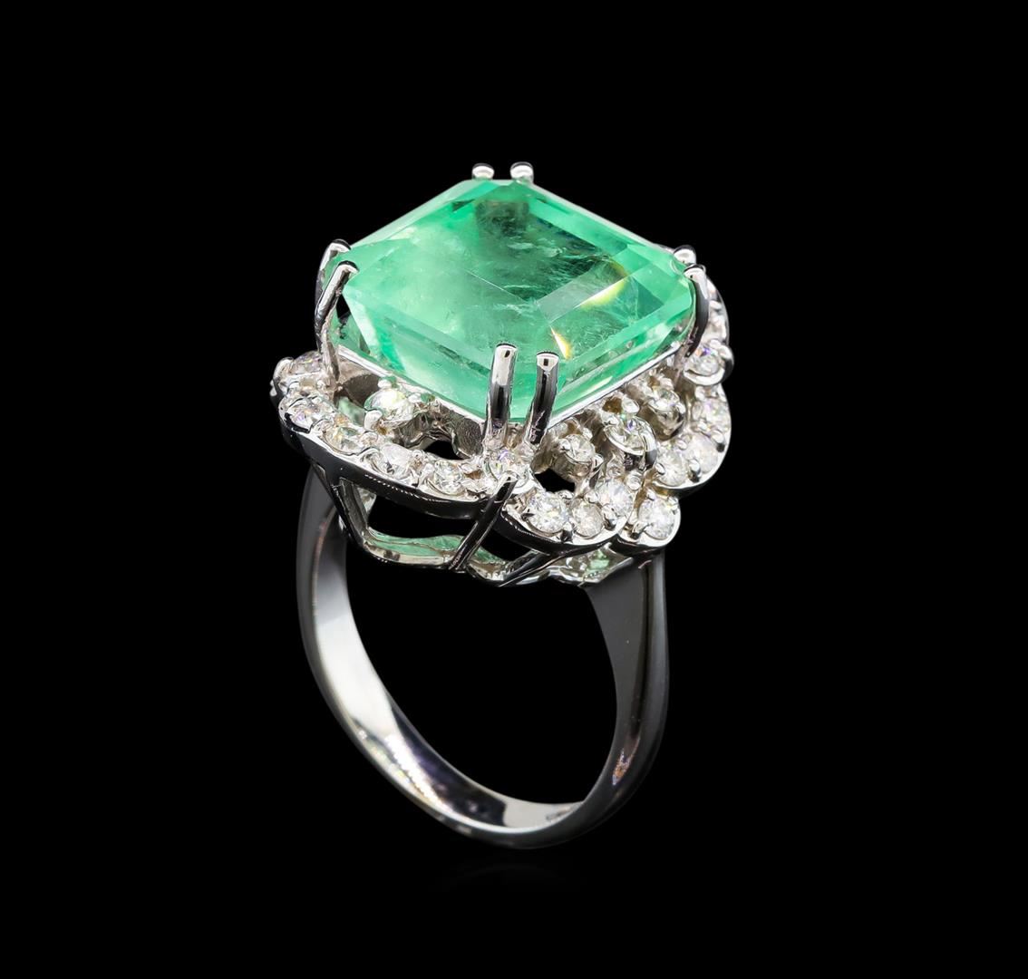 One electronically tested 14KT white gold lady's cast fashion ring with a scalloped basket halo with a bright polish finish. The featured lady's ring has a shank measuring 2.96 millimeters wide. Identified with markings of 'K14'. Condition is new, good workmanship. Containing: One prong set emerald standard step cut natural emerald, measuring 13.15 x 13.00 x 10.14mm, (depth est.) approximate weight of 11.70ct., clarity is moderately included, medium light, moderately strong, green color, (GIA G 4/4), cut is very good. Transmitting light somewhat diffusely, transparent to translucent. Naturally occurring internal & external characteristics are present. Indications of oil residue. Clarity enhanced. Colored gemstones are presumed to have been subjected to commonly used enhancement processes. Graded loose prior to setting in the GIA Laboratory, Report #1172664602. Thirty-Two prong set round brilliant cut diamonds, measuring 2.00 - 1.90 x 1.21mm (depth est.) approximate total weight of 32 Stones = 0.89ct. Graded in the setting. Clarity SI-1 to SI-2. Color: H - I Cut Good Four prong set round brilliant cut diamonds, measuring 1.70 - 1.60 x 1.02mm (depth est.) approximate total weight of 4 Stones = 0.07ct. Graded in the setting. Clarity SI-1 to SI-2. Color: H - I Cut Good. Total Weight of Colored Stones 11.70ct.. Total Weight of Diamonds 0.96ct.. Total Weight of Ring 10.70gm. GAS Appraised at $17,760.00.