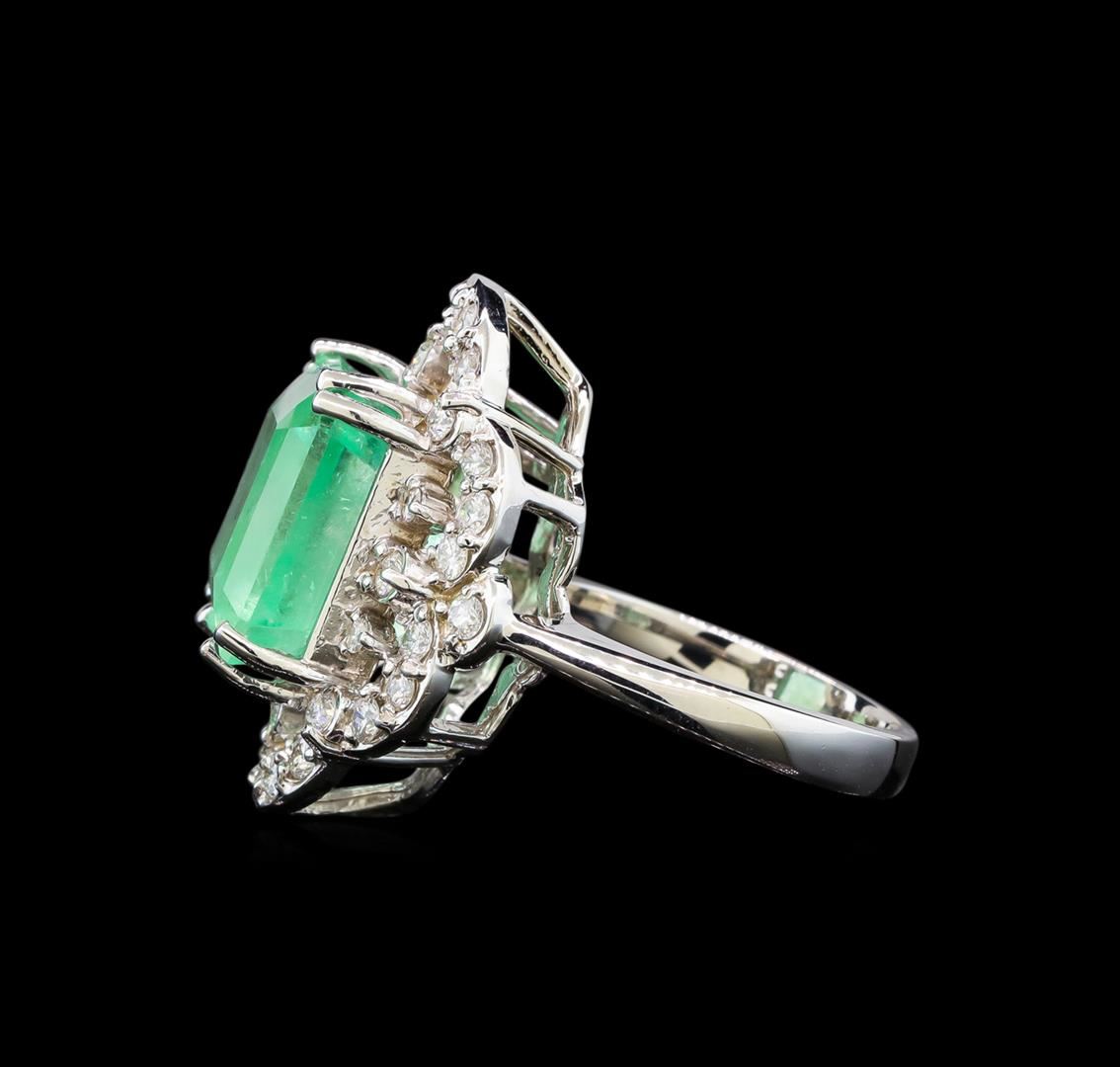 One electronically tested 14KT white gold lady's cast fashion ring with a scalloped basket halo with a bright polish finish. The featured lady's ring has a shank measuring 2.96 millimeters wide. Identified with markings of 'K14'. Condition is new, good workmanship. Containing: One prong set emerald standard step cut natural emerald, measuring 13.15 x 13.00 x 10.14mm, (depth est.) approximate weight of 11.70ct., clarity is moderately included, medium light, moderately strong, green color, (GIA G 4/4), cut is very good. Transmitting light somewhat diffusely, transparent to translucent. Naturally occurring internal & external characteristics are present. Indications of oil residue. Clarity enhanced. Colored gemstones are presumed to have been subjected to commonly used enhancement processes. Graded loose prior to setting in the GIA Laboratory, Report #1172664602. Thirty-Two prong set round brilliant cut diamonds, measuring 2.00 - 1.90 x 1.21mm (depth est.) approximate total weight of 32 Stones = 0.89ct. Graded in the setting. Clarity SI-1 to SI-2. Color: H - I Cut Good Four prong set round brilliant cut diamonds, measuring 1.70 - 1.60 x 1.02mm (depth est.) approximate total weight of 4 Stones = 0.07ct. Graded in the setting. Clarity SI-1 to SI-2. Color: H - I Cut Good. Total Weight of Colored Stones 11.70ct.. Total Weight of Diamonds 0.96ct.. Total Weight of Ring 10.70gm. GAS Appraised at $17,760.00.