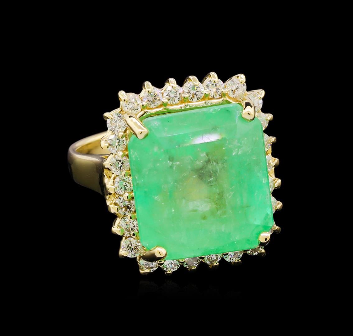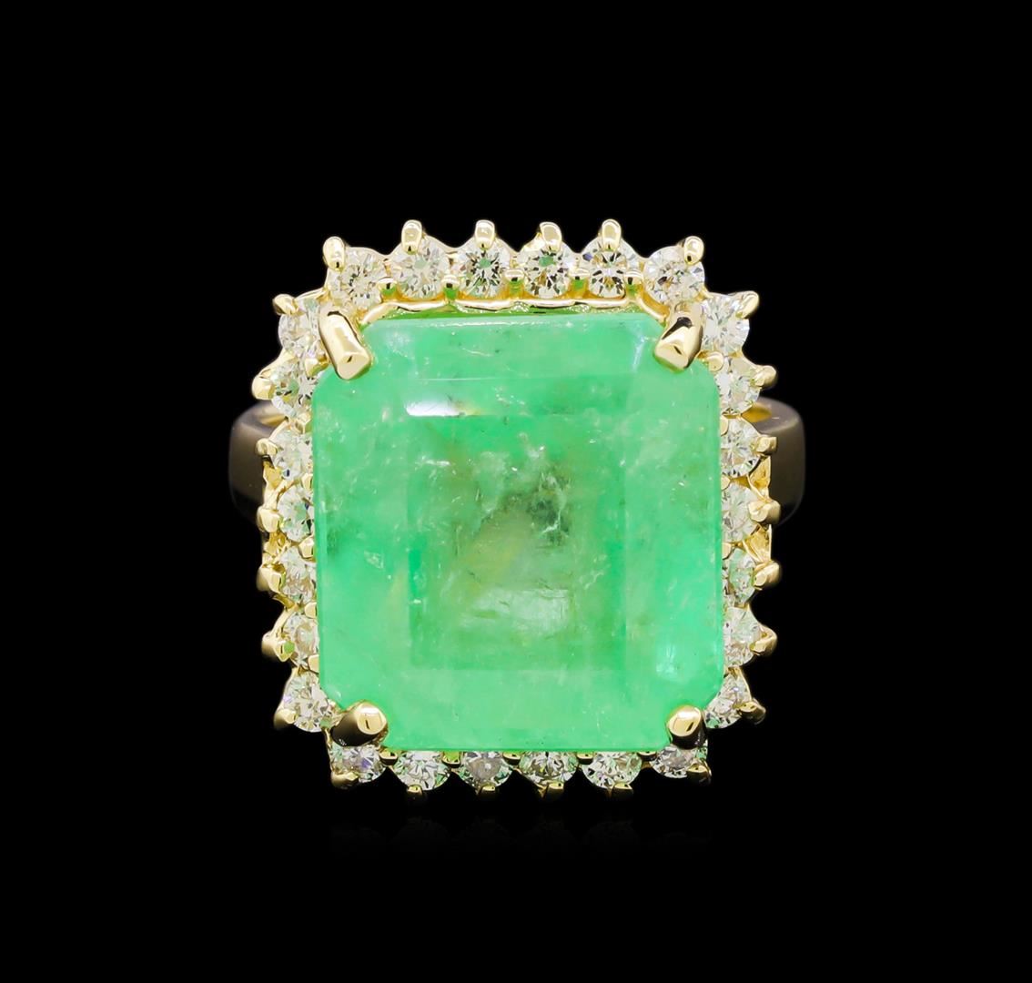 One electronically tested 14KT yellow gold lady's cast fashion ring with a basket halo with a bright polish finish. The featured lady's ring has a shank measuring 2.94 millimeters wide. Identified with markings of "14K". Condition is new, good workmanship. Containing: One prong set emerald step cut natural emerald, measuring 14.01 x 12.85 x 9.65mm, exact weight 11.71ct., clarity is heavily included, type III, medium light, very slightly grayish, green color, (GIA G 4/3), cut is good. Transmitting light somewhat diffusely, semi-transparent to translucent. Naturally occurring internal & external characteristics are present. Clarity enhanced. Graded loose prior to setting in the GIA Laboratory, Report #2175501574.Twenty-Six prong set round brilliant cut diamonds, measuring 2.00 - 1.90 x 1.19mm (depth est.) approximate total weight of 26 Stones = 0.72ct. Graded in the setting. Clarity: VS-2 to SI-2. Color: H - I. Cut Good. Total Weight of Colored Stones 11.71ct. Total Weight of Diamonds 0.72ct. Total Weight of Ring 9.10gm. GAS Appraised at $7,810.00.