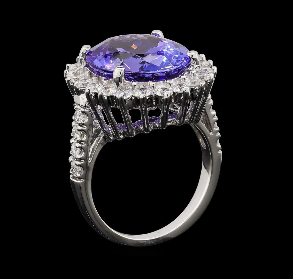 One electronically tested 14KT white gold lady's cast fashion ring with a basket halo with a bright polish finish. The featured lady's ring has a shank measuring 1.95 millimeters wide. Identified with markings of 'K14'. Condition is new, good workmanship. Containing: One prong set oval modified brilliant cut natural tanzanite, measuring 15.80 x 13.07 x 9.03mm, (depth est.) approximate weight of 11.78ct., clarity is eye clean, medium, moderately strong, violet color, (GIA V 5/4), cut is very good. Transmitting light with no distortion, transparent. Colored gemstones are presumed to have been subjected to commonly used enhancement processes. Graded loose prior to setting in the GIA Laboratory, Report #5171847699. Twenty-Two prong set round brilliant cut diamonds, measuring 2.40 - 2.30 x 1.46mm (depth est.) approximate total weight of 22 Stones = 1.08ct. Graded in the setting. Clarity SI-1 to SI-2. Color: G - H Cut Good Eight prong set round brilliant cut diamonds, measuring 2.00 - 1.90 x 1.17mm (depth est.) approximate total weight of 8 Stones = 0.22ct. Graded in the setting. Clarity SI-1 to SI-2. Color: G - I Cut Good. Total Weight of Colored Stones 11.78ct.. Total Weight of Diamonds 1.30ct.. Total Weight of Ring 9.30gm. GAS Appraised at $19,715.00.