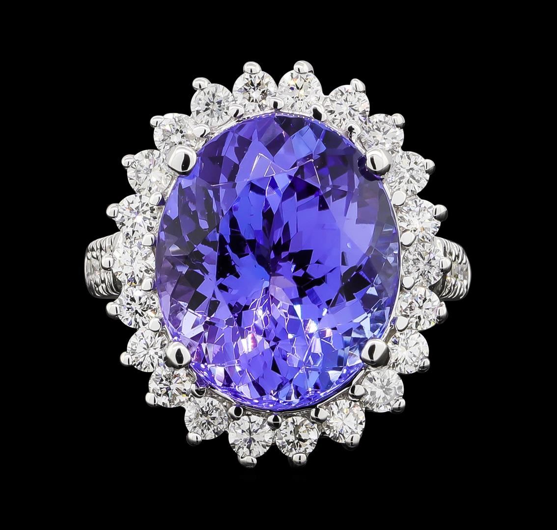 One electronically tested 14KT white gold lady's cast fashion ring with a basket halo with a bright polish finish. The featured lady's ring has a shank measuring 1.95 millimeters wide. Identified with markings of 'K14'. Condition is new, good workmanship. Containing: One prong set oval modified brilliant cut natural tanzanite, measuring 15.80 x 13.07 x 9.03mm, (depth est.) approximate weight of 11.78ct., clarity is eye clean, medium, moderately strong, violet color, (GIA V 5/4), cut is very good. Transmitting light with no distortion, transparent. Colored gemstones are presumed to have been subjected to commonly used enhancement processes. Graded loose prior to setting in the GIA Laboratory, Report #5171847699. Twenty-Two prong set round brilliant cut diamonds, measuring 2.40 - 2.30 x 1.46mm (depth est.) approximate total weight of 22 Stones = 1.08ct. Graded in the setting. Clarity SI-1 to SI-2. Color: G - H Cut Good Eight prong set round brilliant cut diamonds, measuring 2.00 - 1.90 x 1.17mm (depth est.) approximate total weight of 8 Stones = 0.22ct. Graded in the setting. Clarity SI-1 to SI-2. Color: G - I Cut Good. Total Weight of Colored Stones 11.78ct.. Total Weight of Diamonds 1.30ct.. Total Weight of Ring 9.30gm. GAS Appraised at $19,715.00.