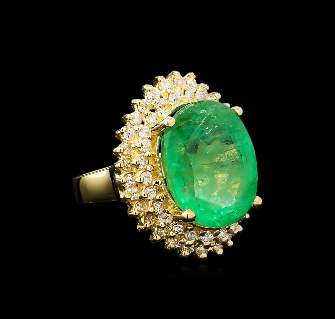 One electronically tested 14KT yellow gold lady's cast fashion ring with a double basket halo with a bright polish finish. The featured lady's ring has a shank measuring 3.40 millimeters wide. Identified with markings of "14K". Condition is new, good workmanship. Containing: One prong set oval modified brilliant cut natural emerald, measuring 16.02 x 12.26 x 9.07mm, 17%. bulge factor, exact weight 11.91ct., clarity is moderately included, type III, medium, very slightly grayish, green color, (GIA G 5/3), cut is good. Transmitting light somewhat diffusely, transparent to translucent. Naturally occurring internal & external characteristics are present. Clarity enhanced. Graded loose prior to setting in the GIA Laboratory, Report #5172501508.Fifty-Six prong set round brilliant cut diamonds, measuring 1.70 - 1.60 x 1.02mm (depth est.) approximate total weight of 56 Stones = 0.95ct. Graded in the setting. Clarity: SI-1 to SI-2. Color: H - I. Cut Good. Total Weight of Colored Stones 11.91ct. Total Weight of Diamonds 0.95ct. Total Weight of Ring 9.70gm. GAS Appraised at $25,485.00.