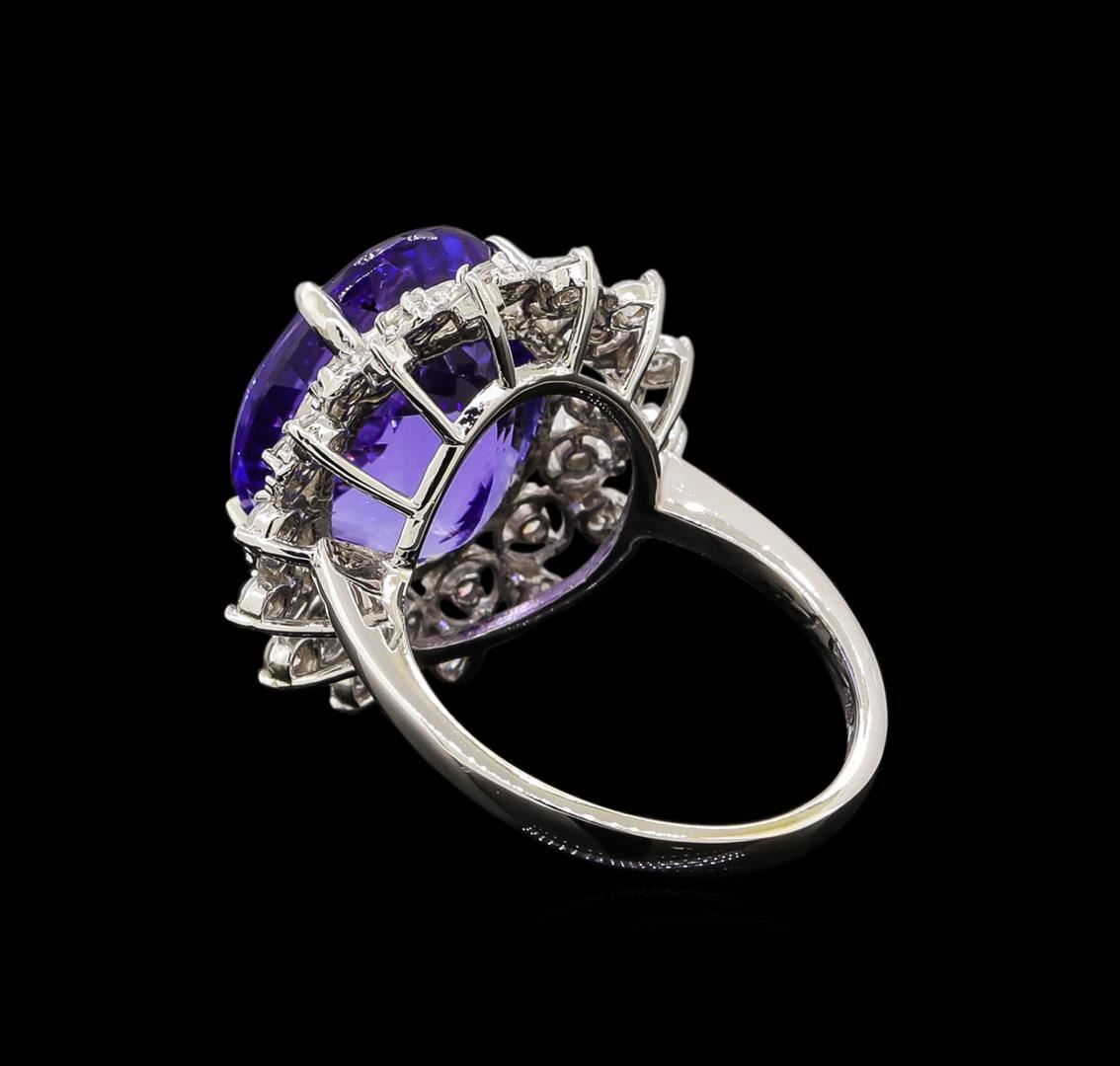 One electronically tested 14KT white gold lady's cast fashion ring with a basket double halo with a bright polish with milgrain detailing finish. The featured lady's ring has a shank measuring 2.32 millimeters wide. Identified with markings of 'K14'. Condition is new, good workmanship. Containing: One prong set oval modified brilliant cut natural tanzanite, measuring 14.46 x 12.15 x 8.80mm, (depth est.) 10%. bulge factor, approximate weight of 11.91ct., clarity is eye clean, medium, moderately strong, violet color, (GIA V 5/4), cut is good. Transmitting light with no distortion, transparent. Colored gemstones are presumed to have been subjected to commonly used enhancement processes. Graded loose prior to setting in the GIA Laboratory, Report #1172665634. Fourteen prong set round brilliant cut diamonds, measuring 2.00 - 1.90 x 1.21mm (depth est.) approximate total weight of 14 Stones = 0.40ct. Graded in the setting. Clarity SI-1 to I-1. Color: H - I Cut Good Fourteen prong set round brilliant cut diamonds, measuring 1.70 - 1.60 x 0.99mm (depth est.) approximate total weight of 14 Stones = 0.22ct. Graded in the setting. Clarity SI-1 to I-1. Color: H - I Cut Good. Total Weight of Colored Stones 11.91ct.. Total Weight of Diamonds 0.62ct.. Total Weight of Ring 7.00gm. GAS Appraised at $16,605.00.