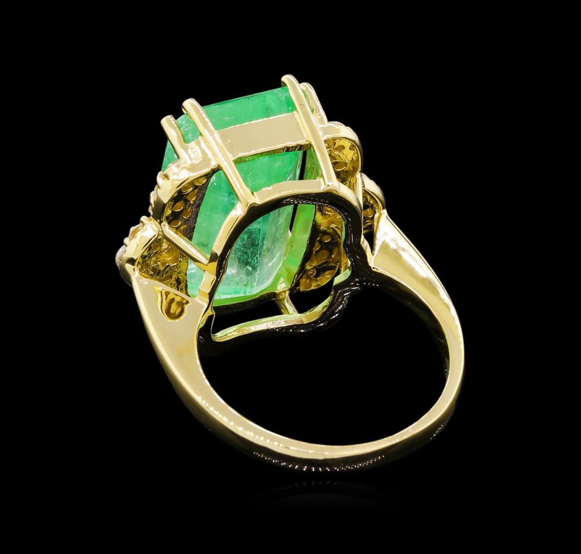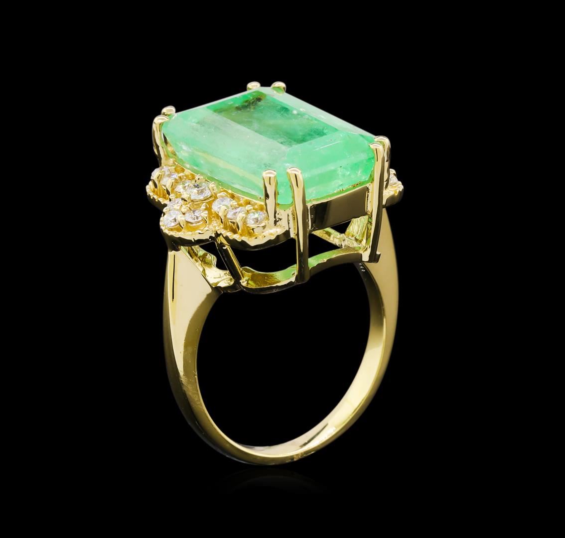 One electronically tested 14KT yellow gold lady's cast fashion ring with a bright polish with milgrain detailing finish. The featured lady's ring has a shank measuring 2.42 millimeters wide. Identified with markings of "K14". Condition is new, good workmanship. Containing: One prong set emerald step cut natural emerald, measuring 17.25 x 11.12 x 8.32mm, 2%. bulge factor, exact weight 12.00ct., clarity is moderately included, type III, medium light, very slightly grayish, green color, (GIA G 4/3), cut is good. Transmitting light somewhat diffusely, transparent to translucent. Naturally occurring internal & external characteristics are present. Clarity enhanced. Graded loose prior to setting in the GIA Laboratory, Report #5172501898.Two prong set round brilliant cut diamonds, measuring 2.80 - 2.70 x 1.65mm (depth est.) approximate total weight of 2 Stones = 0.15ct. Graded in the setting. Clarity: SI-1 to SI-2. Color: H - I. Cut Very Good Eighteen prong set round brilliant cut diamonds, measuring 1.80 - 1.75 x 1.10mm (depth est.) approximate total weight of 18 Stones = 0.38ct. Graded in the setting. Clarity: SI-1 to SI-2. Color: G - Very Good. Total Weight of Colored Stones 12.00ct. Total Weight of Diamonds 0.53ct. Total Weight of Ring 9.60gm. GAS Appraised at $9,550.00.