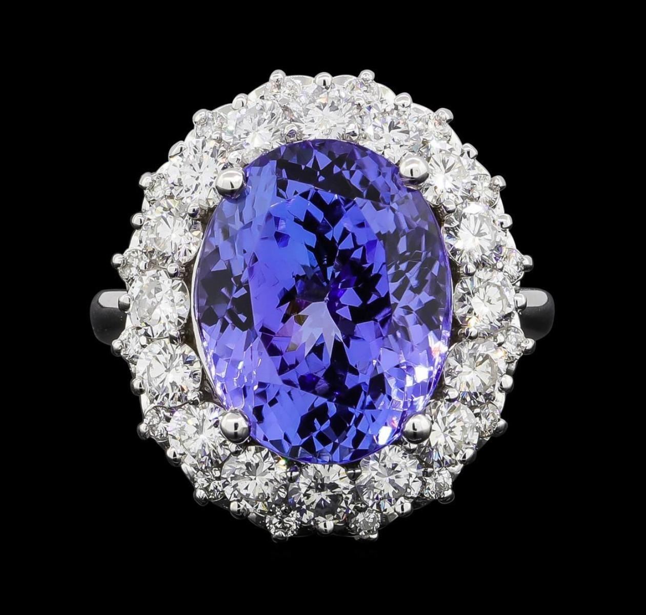 One electronically tested 14KT white gold lady's cast fashion ring with a basket double halo with a bright polish finish. The featured lady's ring has a shank measuring 2.69 millimeters wide. Identified with markings of '14K'. Condition is new, good workmanship. Containing: One prong set oval modified brilliant cut natural tanzanite, measuring 14.46 x 11.44 x 9.73mm, (depth est.) 6%. bulge factor, approximate weight of 12.06ct., clarity is eye clean, medium, very slightly grayish, bluish violet color, (GIA bV 5/3), cut is very good. Transmitting light with no distortion, transparent. Colored gemstones are presumed to have been subjected to commonly used enhancement processes. Graded loose prior to setting in the GIA Laboratory, Report #5171847682. Sixteen prong set round brilliant cut diamonds, measuring 3.10 - 3.00 x 1.89mm (depth est.) approximate total weight of 16 Stones = 1.75ct. Graded in the setting. Clarity SI-1 to SI-2. Color: G - H Cut Good Sixteen prong set round brilliant cut diamonds, measuring 1.60 - 1.50 x 0.96mm (depth est.) approximate total weight of 16 Stones = 0.23ct. Graded in the setting. Clarity SI-1 to SI-2. Color: G - H Cut Good. Total Weight of Colored Stones 12.06ct.. Total Weight of Diamonds 1.98ct.. Total Weight of Ring 9.50gm. GAS Appraised.