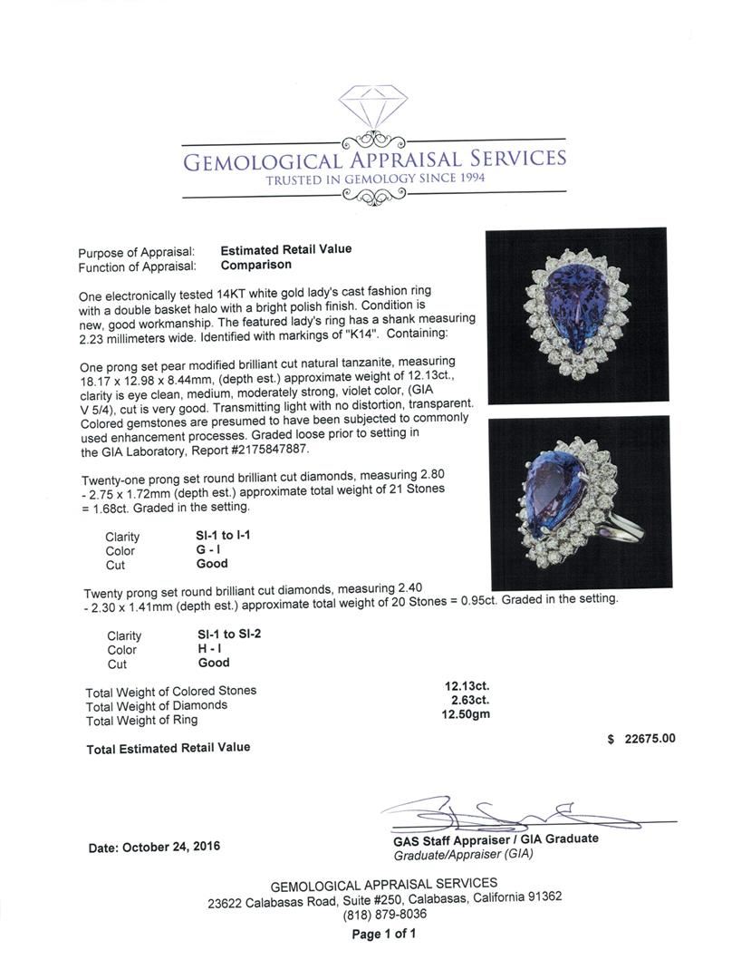 One electronically tested 14KT white gold lady's cast fashion ring with a double basket halo with a bright polish finish. The featured lady's ring has a shank measuring 2.23 millimeters wide. Identified with markings of 'K14'. Condition is new, good workmanship. Containing: One prong set pear modified brilliant cut natural tanzanite, measuring 18.17 x 12.98 x 8.44mm, (depth est.) approximate weight of 12.13ct., clarity is eye clean, medium, moderately strong, violet color, (GIA V 5/4), cut is very good. Transmitting light with no distortion, transparent. Colored gemstones are presumed to have been subjected to commonly used enhancement processes. Graded loose prior to setting in the GIA Laboratory, Report #2175847887. Twenty-One prong set round brilliant cut diamonds, measuring 2.80 - 2.75 x 1.72mm (depth est.) approximate total weight of 21 Stones = 1.68ct. Graded in the setting. Clarity SI-1 to I-1. Color: G - I Cut Good Twenty prong set round brilliant cut diamonds, measuring 2.40 - 2.30 x 1.41mm (depth est.) approximate total weight of 20 Stones = 0.95ct. Graded in the setting. Clarity SI-1 to SI-2. Color: H - I Cut Good. Total Weight of Colored Stones 12.13ct.. Total Weight of Diamonds 2.63ct.. Total Weight of Ring 12.50gm. GAS Appraised at $22,675.00.