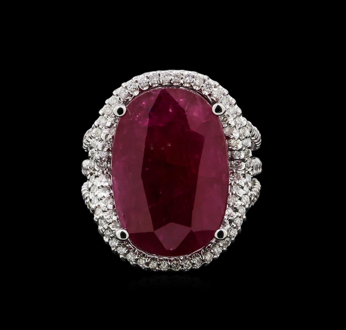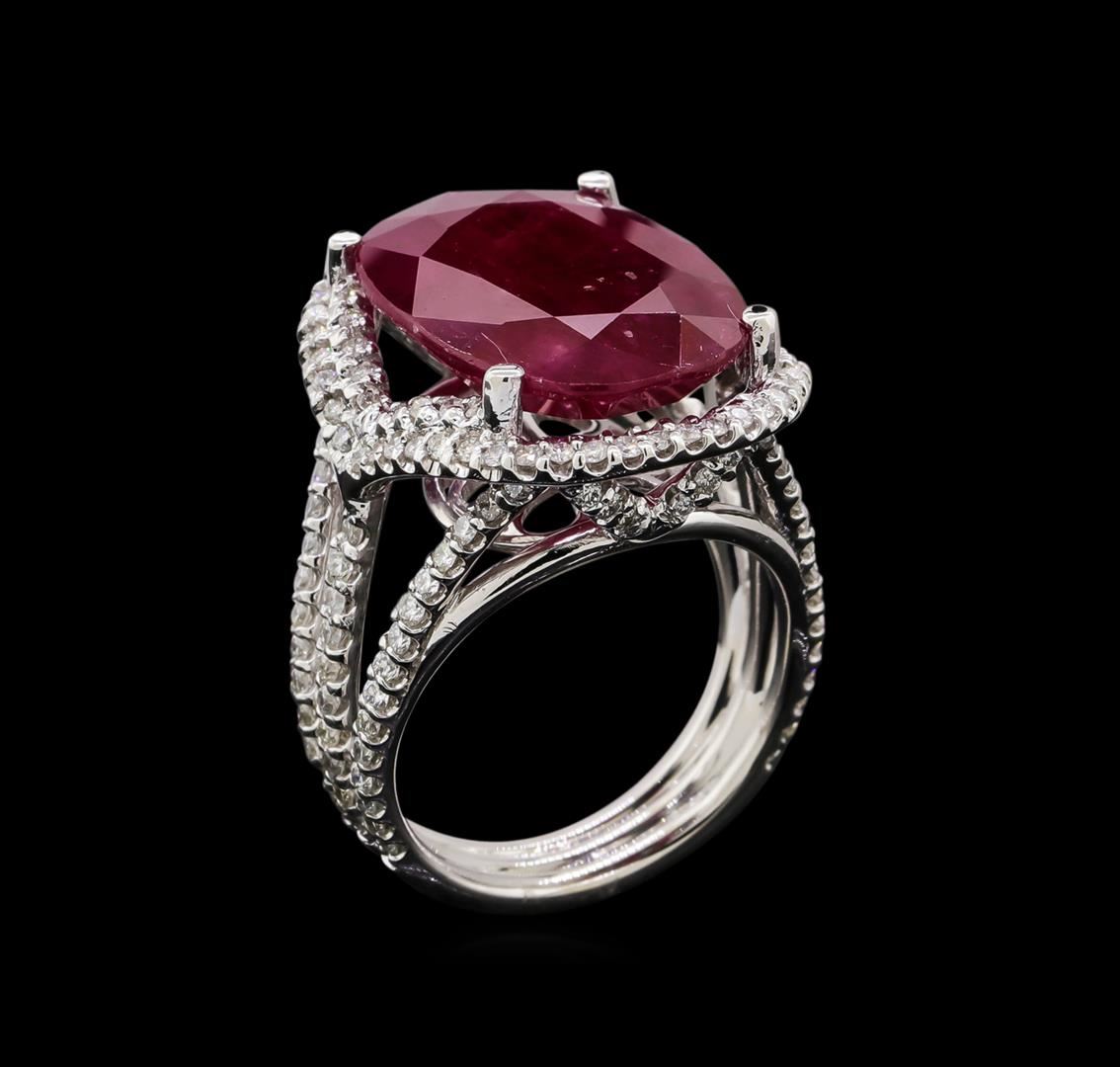 One electronically tested 14KT white gold lady's cast fashion ring with a cathedral basket halo with a bright polish finish. The featured lady's ring has a triple shank measuring 4.45 millimeters in width. Identified with markings of '14K'. Condition is new, good workmanship. Containing: One prong set oval modified step cut natural ruby, measuring 18.62 x 12.93 x 4.73mm, (depth est.) 20%. bulge factor, approximate weight of 12.23ct., clarity is heavily included, medium dark, moderately strong, strongly purplish red color, (GIA stpR 6/4), cut is very good. Transmitting light somewhat diffusely, transparent to translucent. Indications of laboratory high temperature heat treatment. Naturally occurring internal & external characteristics are present. Colored gemstones are presumed to have been subjected to commonly used enhancement processes. Graded loose prior to setting in the GIA Laboratory, Report #5172603379. Eighty prong set round brilliant cut diamonds, measuring 1.45 - 1.35 x 0.87mm (depth est.) approximate total weight of 80 Stones = 0.81ct. Graded in the setting. Clarity SI-1 to SI-2. Color: G - H Cut Good Eighty prong set round brilliant cut diamonds, measuring 1.25 - 1.15 x 0.73mm (depth est.) approximate total weight of 80 Stones = 0.50ct. Graded in the setting. Clarity SI-1 to I-1. Color: G - H Cut Good. Total Weight of Colored Stones 12.23ct.. Total Weight of Diamonds 1.31ct.. Total Weight of Ring 10.70gm. GAS Appraised at $30,165.00.
