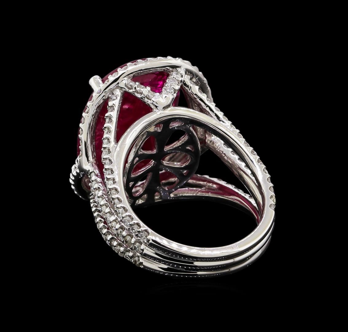 One electronically tested 14KT white gold lady's cast fashion ring with a cathedral basket halo with a bright polish finish. The featured lady's ring has a triple shank measuring 4.45 millimeters in width. Identified with markings of '14K'. Condition is new, good workmanship. Containing: One prong set oval modified step cut natural ruby, measuring 18.62 x 12.93 x 4.73mm, (depth est.) 20%. bulge factor, approximate weight of 12.23ct., clarity is heavily included, medium dark, moderately strong, strongly purplish red color, (GIA stpR 6/4), cut is very good. Transmitting light somewhat diffusely, transparent to translucent. Indications of laboratory high temperature heat treatment. Naturally occurring internal & external characteristics are present. Colored gemstones are presumed to have been subjected to commonly used enhancement processes. Graded loose prior to setting in the GIA Laboratory, Report #5172603379. Eighty prong set round brilliant cut diamonds, measuring 1.45 - 1.35 x 0.87mm (depth est.) approximate total weight of 80 Stones = 0.81ct. Graded in the setting. Clarity SI-1 to SI-2. Color: G - H Cut Good Eighty prong set round brilliant cut diamonds, measuring 1.25 - 1.15 x 0.73mm (depth est.) approximate total weight of 80 Stones = 0.50ct. Graded in the setting. Clarity SI-1 to I-1. Color: G - H Cut Good. Total Weight of Colored Stones 12.23ct.. Total Weight of Diamonds 1.31ct.. Total Weight of Ring 10.70gm. GAS Appraised at $30,165.00.