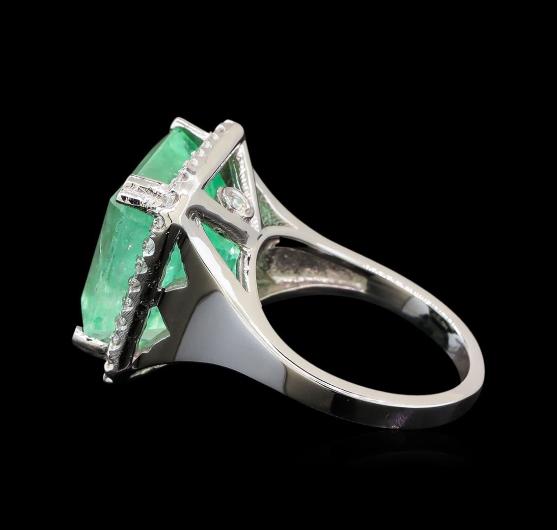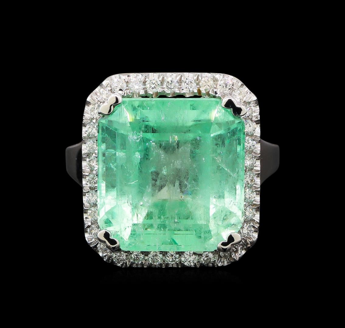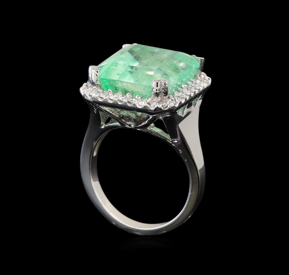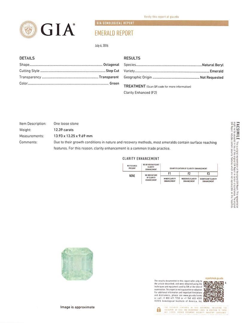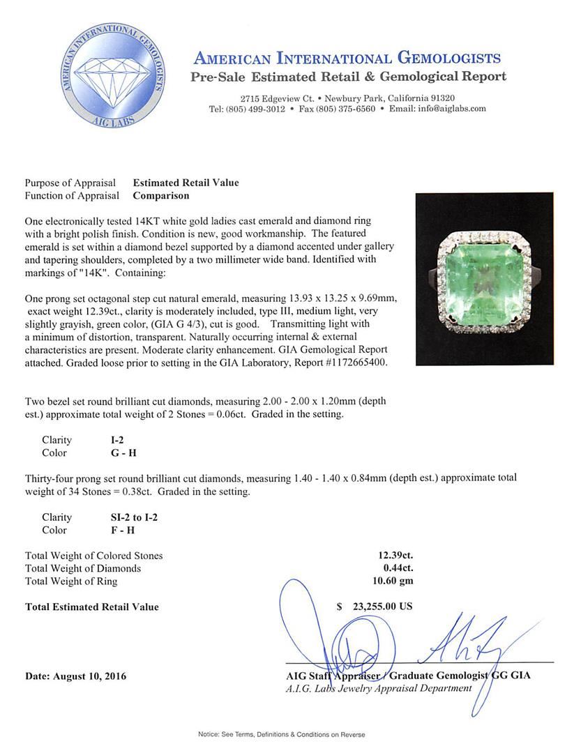 One electronically tested 14KT white gold ladies cast emerald and diamond ring with a bright polish finish. The featured emerald is set within a diamond bezel supported by a diamond accented under gallery and tapering shoulders, completed by a two millimeter wide band. Identified with markings of '14K'. Condition is new, good workmanship. Containing: One prong set octagonal step cut natural emerald, measuring 13.93 x 13.25 x 9.69mm, exact weight 12.39ct., clarity is moderately included, type III, medium light, very slightly grayish, green color, (GIA G 4/3), cut is good. Transmitting light with a minimum of distortion, transparent. Naturally occurring internal & external characteristics are present. Moderate clarity enhancement. GIA Gemological Report attached. Graded loose prior to setting in the GIA Laboratory, Report #1172665400. Two bezel set round brilliant cut diamonds, measuring 2.00 - 2.00 x 1.20mm (depth est.) approximate total weight of 2 Stones = 0.06ct. Graded in the setting. Clarity I-2. Color: G - H Thirty-Four prong set round brilliant cut diamonds, measuring 1.40 - 1.40 x 0.84mm (depth est.) approximate total weight of 34 Stones = 0.38ct. Graded in the setting. Clarity SI-2 to I-2. Color: F - H. Total Weight of Colored Stones 12.39ct.. Total Weight of Diamonds 0.44ct.. Total Weight of Ring 10.60gm. AIG Appraised at $23,255.00.