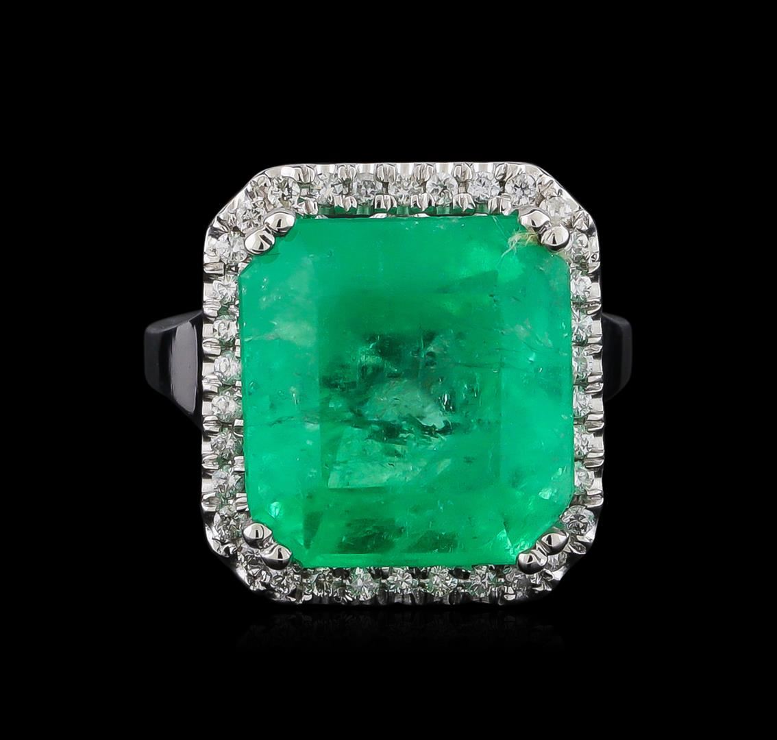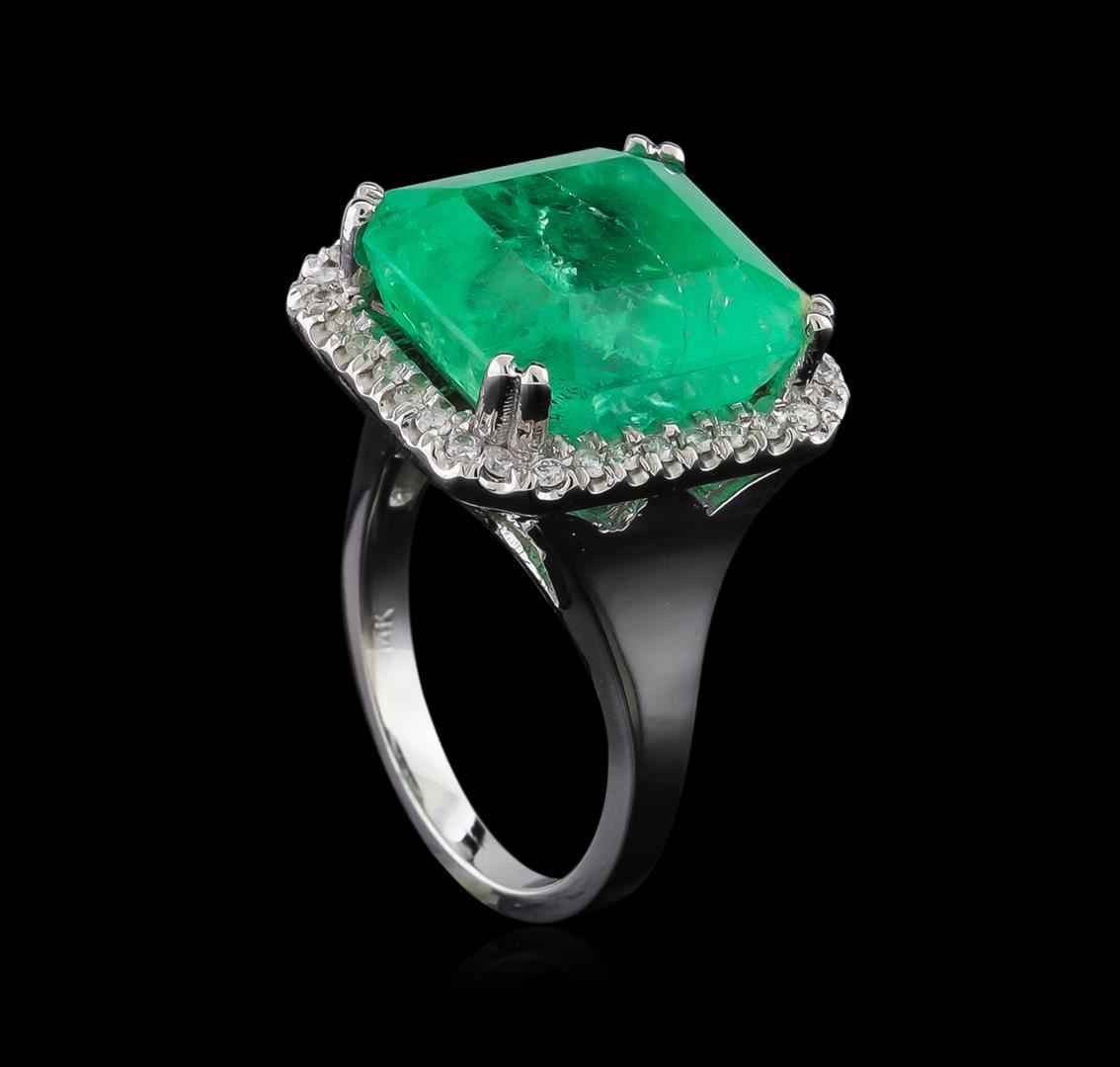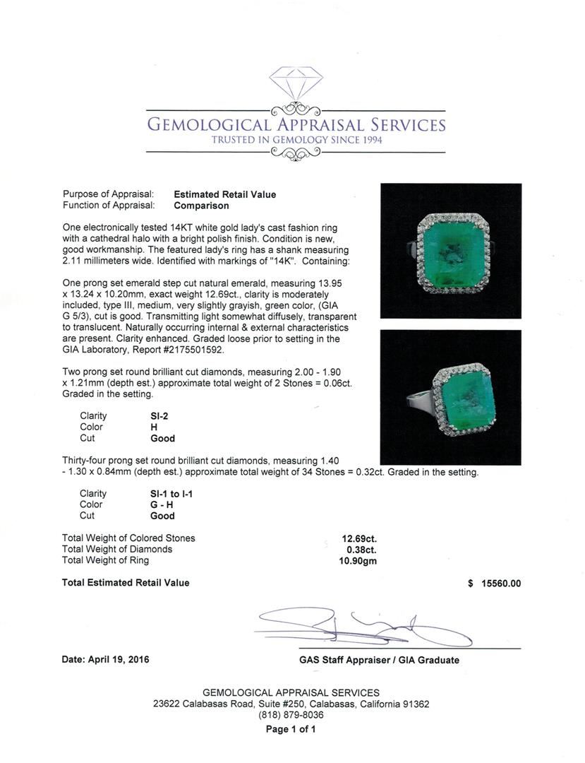 One electronically tested 14KT white gold lady's cast fashion ring with a cathedral halo with a bright polish finish. The featured lady's ring has a shank measuring 2.11 millimeters wide. Identified with markings of "14K". Condition is new, good workmanship. Containing: One prong set emerald step cut natural emerald, measuring 13.95 x 13.24 x 10.20mm, exact weight 12.69ct., clarity is moderately included, type III, medium, very slightly grayish, green color, (GIA G 5/3), cut is good. Transmitting light somewhat diffusely, transparent to translucent. Naturally occurring internal & external characteristics are present. Clarity enhanced. Graded loose prior to setting in the GIA Laboratory, Report #2175501592.Two prong set round brilliant cut diamonds, measuring 2.00 - 1.90 x 1.21mm (depth est.) approximate total weight of 2 Stones = 0.06ct. Graded in the setting. Clarity: SI-2. Color: H. Cut Good Thirty-Four prong set round brilliant cut diamonds, measuring 1.40 - 1.30 x 0.84mm (depth est.) approximate total weight of 34 Stones = 0.32ct. Graded in the setting. Clarity: SI-1 to I-1. Color: G - Good. Total Weight of Colored Stones 12.69ct. Total Weight of Diamonds 0.38ct. Total Weight of Ring 10.90gm. GAS Appraised at $15,560.00.