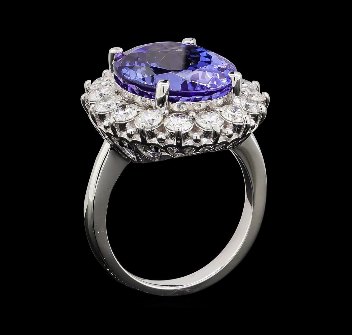One electronically tested 14KT white gold lady's cast fashion ring with a basket halo with a bright polish finish. The featured lady's ring has a shank measuring 2.56 millimeters wide. Identified with markings of 'K14'. Condition is new, good workmanship. Containing: One prong set oval modified brilliant cut natural tanzanite, measuring 15.23 x 12.90 x 9.10mm, (depth est.) 3%. bulge factor, approximate weight of 12.99ct., clarity is eye clean, medium dark, moderately strong, violetish blue color, (GIA vB 6/4), cut is good. Transmitting light with no distortion, transparent. Colored gemstones are presumed to have been subjected to commonly used enhancement processes. Graded loose prior to setting in the GIA Laboratory, Report #2175847686. Sixteen prong set round brilliant cut diamonds, measuring 3.10 - 3.00 x 1.86mm (depth est.) approximate total weight of 16 Stones = 1.70ct. Graded in the setting. Clarity SI-1 to SI-2. Color: G - H Cut Good. Total Weight of Colored Stones 12.99ct.. Total Weight of Diamonds 1.70ct.. Total Weight of Ring 9.30gm. GAS Appraised at $23,970.00.