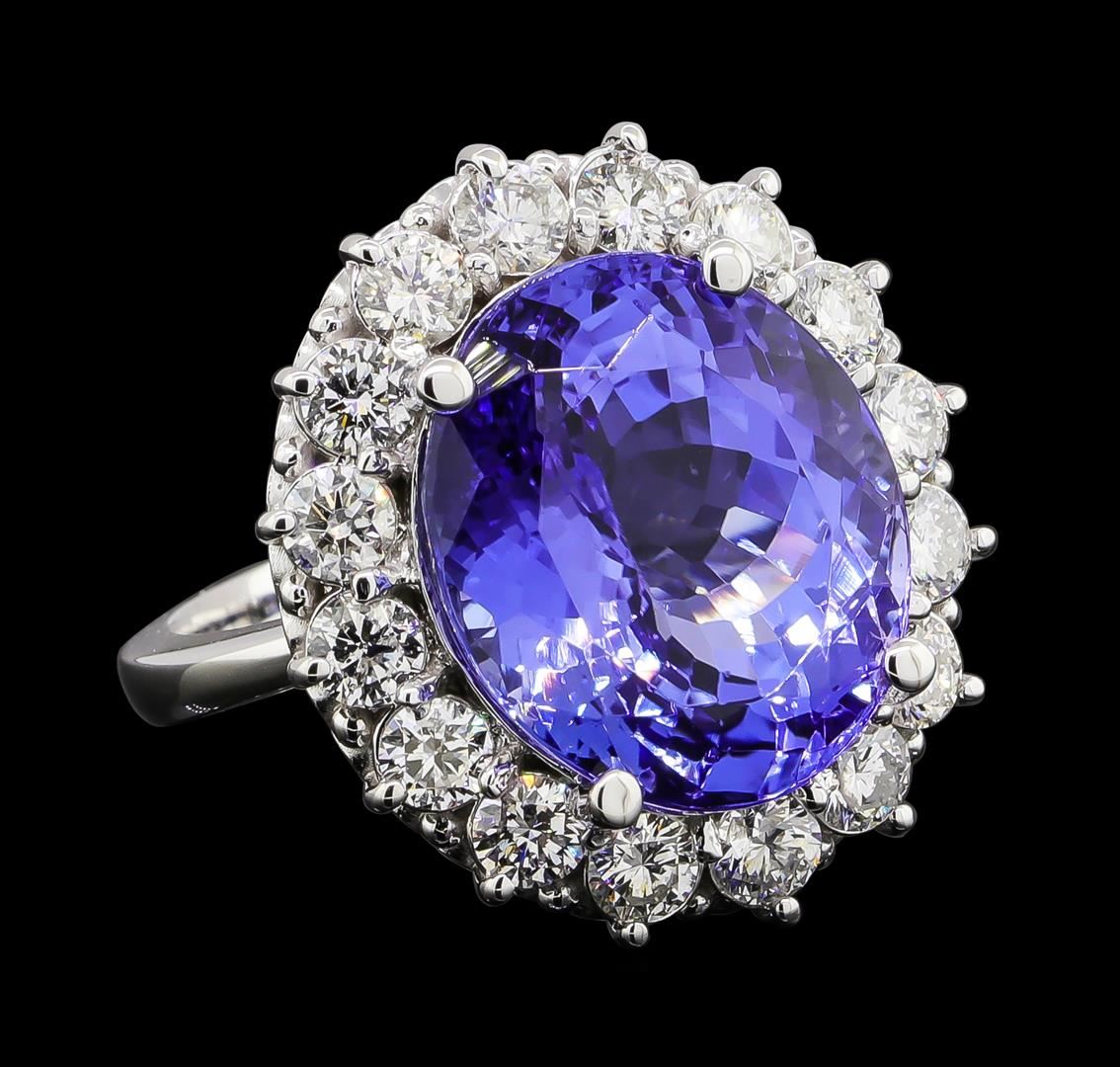 One electronically tested 14KT white gold lady's cast fashion ring with a basket halo with a bright polish finish. The featured lady's ring has a shank measuring 2.56 millimeters wide. Identified with markings of 'K14'. Condition is new, good workmanship. Containing: One prong set oval modified brilliant cut natural tanzanite, measuring 15.23 x 12.90 x 9.10mm, (depth est.) 3%. bulge factor, approximate weight of 12.99ct., clarity is eye clean, medium dark, moderately strong, violetish blue color, (GIA vB 6/4), cut is good. Transmitting light with no distortion, transparent. Colored gemstones are presumed to have been subjected to commonly used enhancement processes. Graded loose prior to setting in the GIA Laboratory, Report #2175847686. Sixteen prong set round brilliant cut diamonds, measuring 3.10 - 3.00 x 1.86mm (depth est.) approximate total weight of 16 Stones = 1.70ct. Graded in the setting. Clarity SI-1 to SI-2. Color: G - H Cut Good. Total Weight of Colored Stones 12.99ct.. Total Weight of Diamonds 1.70ct.. Total Weight of Ring 9.30gm. GAS Appraised at $23,970.00.