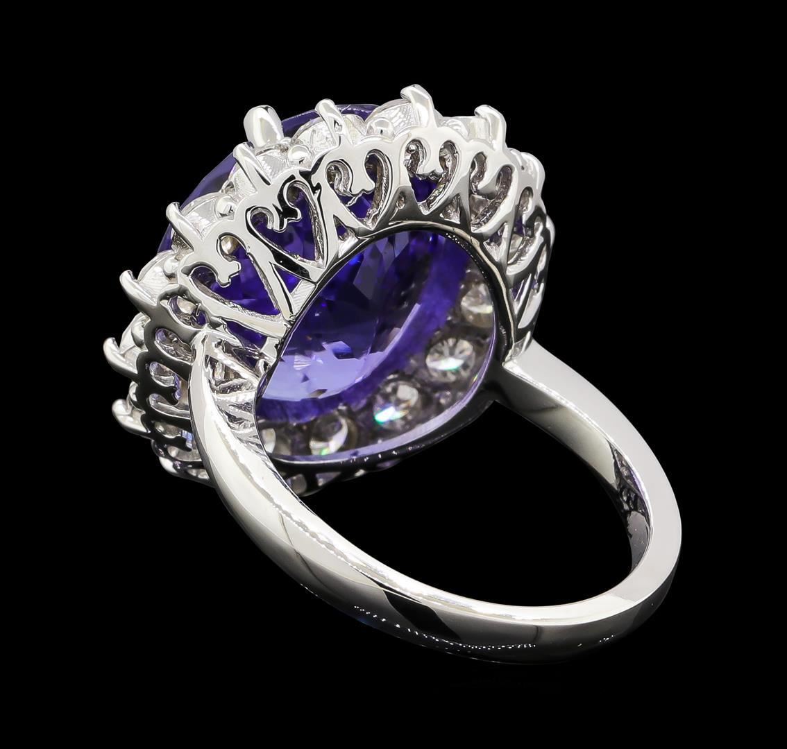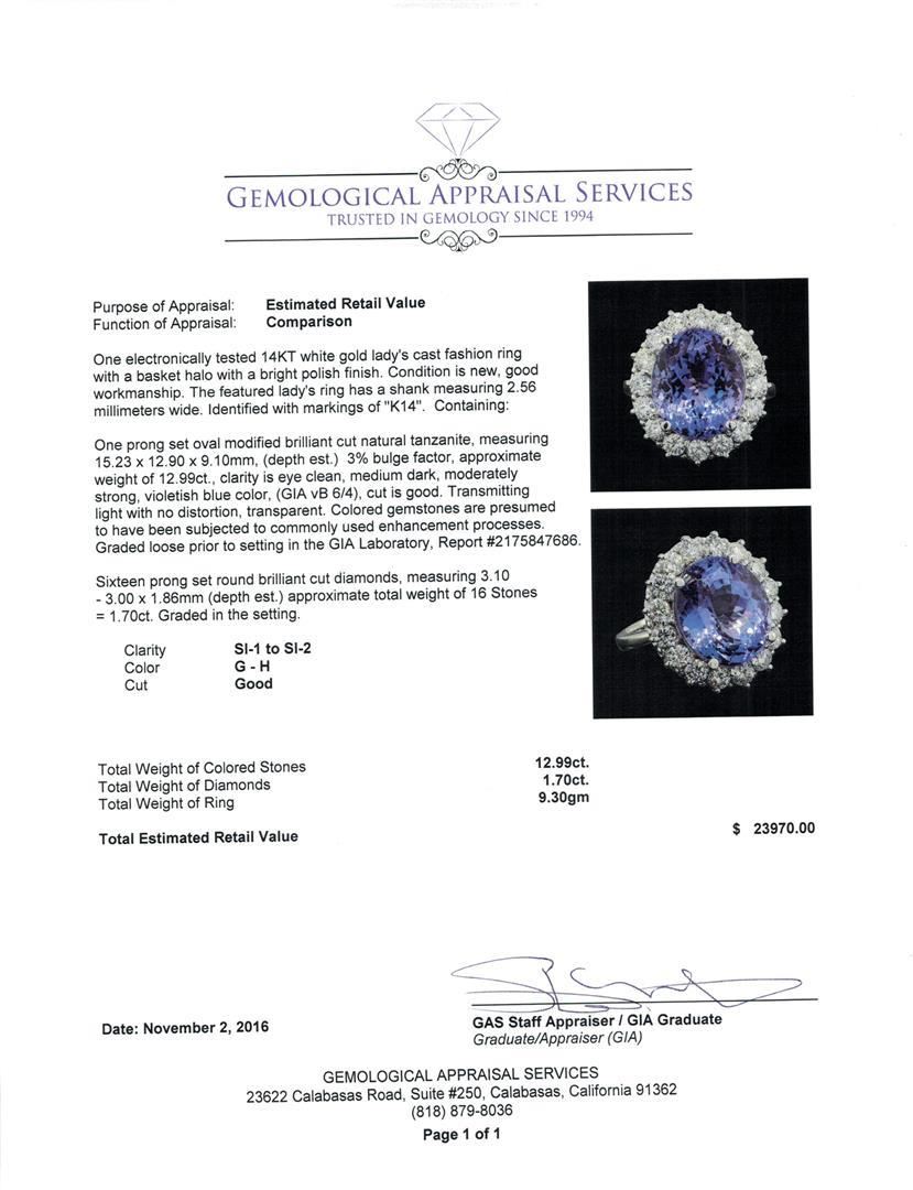 One electronically tested 14KT white gold lady's cast fashion ring with a basket halo with a bright polish finish. The featured lady's ring has a shank measuring 2.56 millimeters wide. Identified with markings of 'K14'. Condition is new, good workmanship. Containing: One prong set oval modified brilliant cut natural tanzanite, measuring 15.23 x 12.90 x 9.10mm, (depth est.) 3%. bulge factor, approximate weight of 12.99ct., clarity is eye clean, medium dark, moderately strong, violetish blue color, (GIA vB 6/4), cut is good. Transmitting light with no distortion, transparent. Colored gemstones are presumed to have been subjected to commonly used enhancement processes. Graded loose prior to setting in the GIA Laboratory, Report #2175847686. Sixteen prong set round brilliant cut diamonds, measuring 3.10 - 3.00 x 1.86mm (depth est.) approximate total weight of 16 Stones = 1.70ct. Graded in the setting. Clarity SI-1 to SI-2. Color: G - H Cut Good. Total Weight of Colored Stones 12.99ct.. Total Weight of Diamonds 1.70ct.. Total Weight of Ring 9.30gm. GAS Appraised.