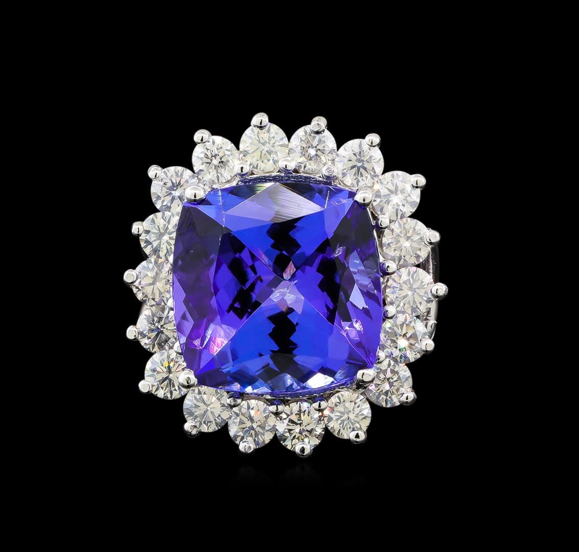 One electronically tested 14KT white gold lady's cast fashion ring with a split shank basket halo with a bright polish finish. The featured lady's ring has a shank measuring 2.50 millimeters wide. Identified with markings of '14K'. Condition is new, good workmanship. Containing: One prong set square cushion modified brilliant cut natural tanzanite, measuring 14.28 x 14.10 x 8.73mm, (depth est.) approximate weight of 13.03ct., clarity is eye clean, medium dark, moderately strong, bluish violet color, (GIA bV 6/4), cut is very good. Transmitting light with no distortion, transparent. Colored gemstones are presumed to have been subjected to commonly used enhancement processes. Graded loose prior to setting in the GIA Laboratory, Report #6177668372. Eighteen prong set round brilliant cut diamonds, measuring 3.50 - 3.40 x 2.07mm (depth est.) approximate total weight of 18 Stones = 2.73ct. Graded in the setting. Clarity SI-1 to I-1. Color: H - J Cut Very Good. Total Weight of Colored Stones 13.03ct.. Total Weight of Diamonds 2.73ct.. Total Weight of Ring 10.80gm. GAS Appraised at $26,510.00.