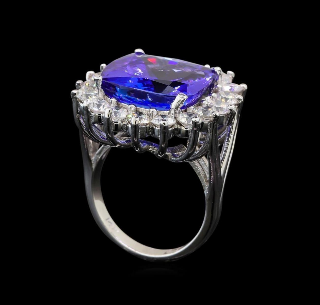 One electronically tested 14KT white gold lady's cast fashion ring with a split shank basket halo with a bright polish finish. The featured lady's ring has a shank measuring 2.50 millimeters wide. Identified with markings of '14K'. Condition is new, good workmanship. Containing: One prong set square cushion modified brilliant cut natural tanzanite, measuring 14.28 x 14.10 x 8.73mm, (depth est.) approximate weight of 13.03ct., clarity is eye clean, medium dark, moderately strong, bluish violet color, (GIA bV 6/4), cut is very good. Transmitting light with no distortion, transparent. Colored gemstones are presumed to have been subjected to commonly used enhancement processes. Graded loose prior to setting in the GIA Laboratory, Report #6177668372. Eighteen prong set round brilliant cut diamonds, measuring 3.50 - 3.40 x 2.07mm (depth est.) approximate total weight of 18 Stones = 2.73ct. Graded in the setting. Clarity SI-1 to I-1. Color: H - J Cut Very Good. Total Weight of Colored Stones 13.03ct.. Total Weight of Diamonds 2.73ct.. Total Weight of Ring 10.80gm. GAS Appraised.