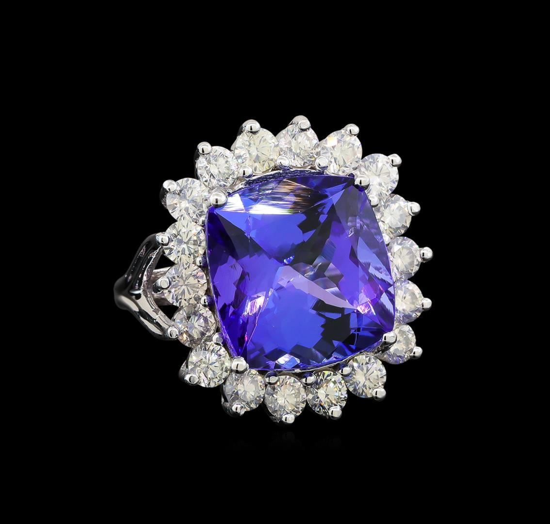One electronically tested 14KT white gold lady's cast fashion ring with a split shank basket halo with a bright polish finish. The featured lady's ring has a shank measuring 2.50 millimeters wide. Identified with markings of '14K'. Condition is new, good workmanship. Containing: One prong set square cushion modified brilliant cut natural tanzanite, measuring 14.28 x 14.10 x 8.73mm, (depth est.) approximate weight of 13.03ct., clarity is eye clean, medium dark, moderately strong, bluish violet color, (GIA bV 6/4), cut is very good. Transmitting light with no distortion, transparent. Colored gemstones are presumed to have been subjected to commonly used enhancement processes. Graded loose prior to setting in the GIA Laboratory, Report #6177668372. Eighteen prong set round brilliant cut diamonds, measuring 3.50 - 3.40 x 2.07mm (depth est.) approximate total weight of 18 Stones = 2.73ct. Graded in the setting. Clarity SI-1 to I-1. Color: H - J Cut Very Good. Total Weight of Colored Stones 13.03ct.. Total Weight of Diamonds 2.73ct.. Total Weight of Ring 10.80gm. GAS Appraised.