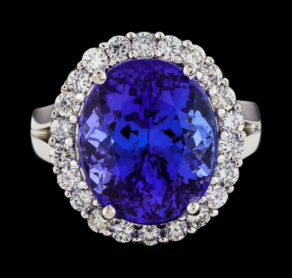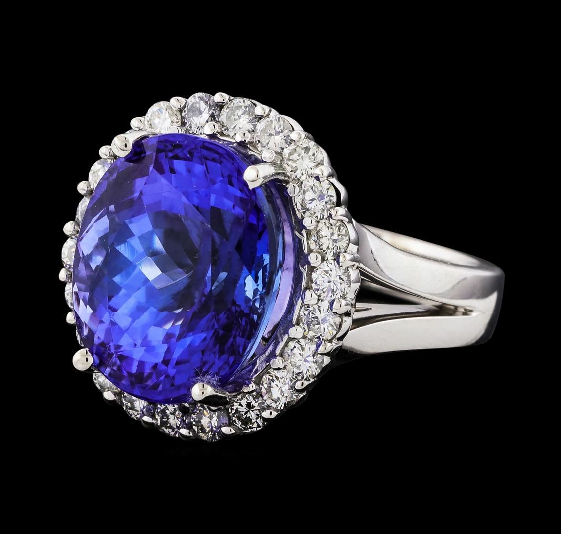 One electronically tested 14KT white gold lady's cast fashion ring with a split shank basket halo with a bright polish finish. The featured lady's ring has a shank measuring 3.50 millimeters wide. Identified with markings of '14K'. Condition is new, good workmanship. Containing: One prong set oval modified brilliant cut natural tanzanite, measuring 14.62 x 12.24 x 10.26mm, (depth est.) 3%. bulge factor, approximate weight of 13.23ct., clarity is eye clean, medium dark, moderately strong, violetish blue color, (GIA vB 6/4), cut is very good. Transmitting light with no distortion, transparent. Colored gemstones are presumed to have been subjected to commonly used enhancement processes. Graded loose prior to setting in the GIA Laboratory, Report #5172847714. Twenty-Two prong set round brilliant cut diamonds, measuring 2.40 - 2.30 x 1.41mm (depth est.) approximate total weight of 22 Stones = 1.03ct. Graded in the setting. Clarity SI-1 to SI-2. Color: H - I Cut Good. Total Weight of Colored Stones 13.23ct.. Total Weight of Diamonds 1.03ct.. Total Weight of Ring 11.80gm. GAS Appraised at $23,760.00.