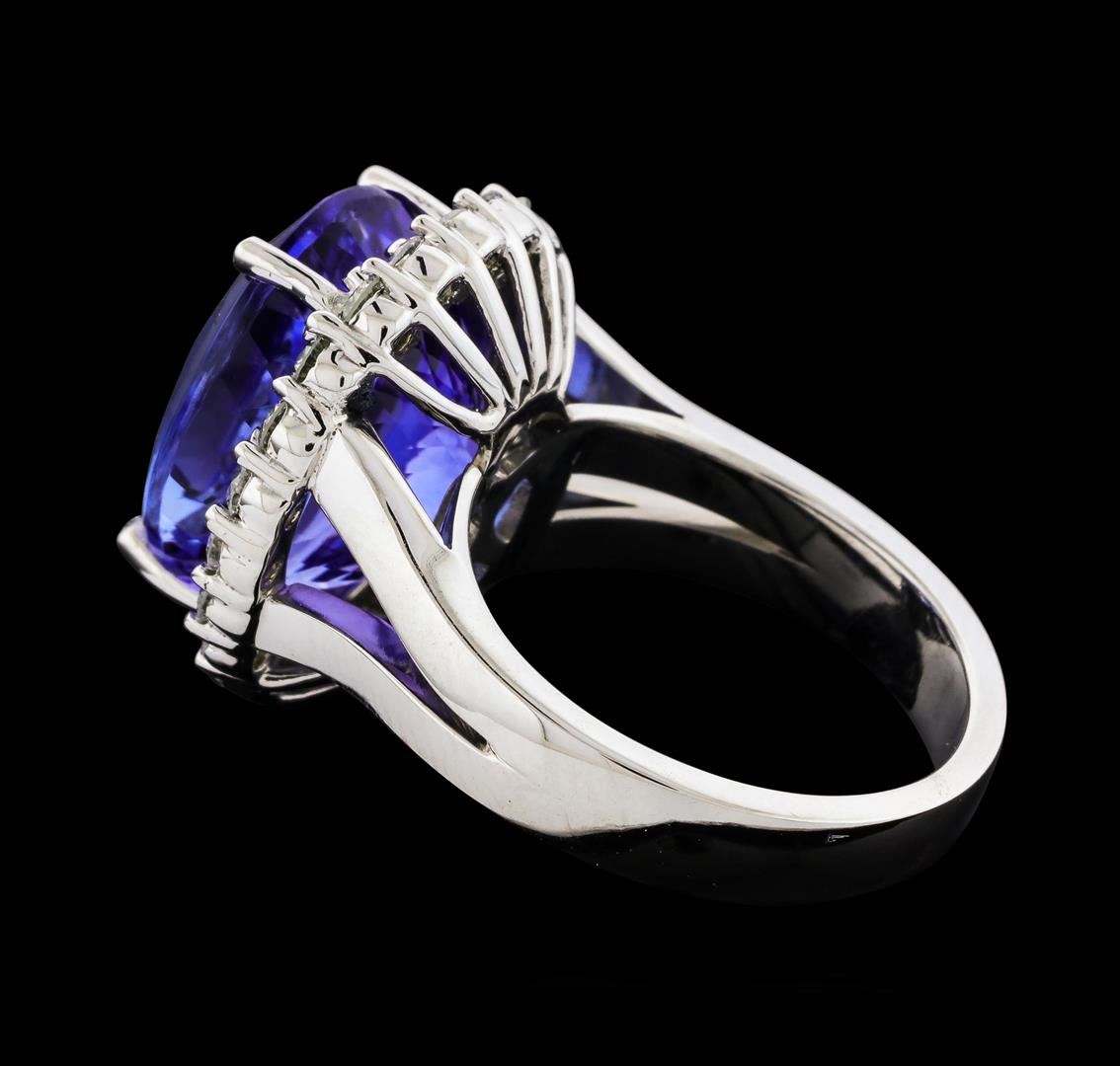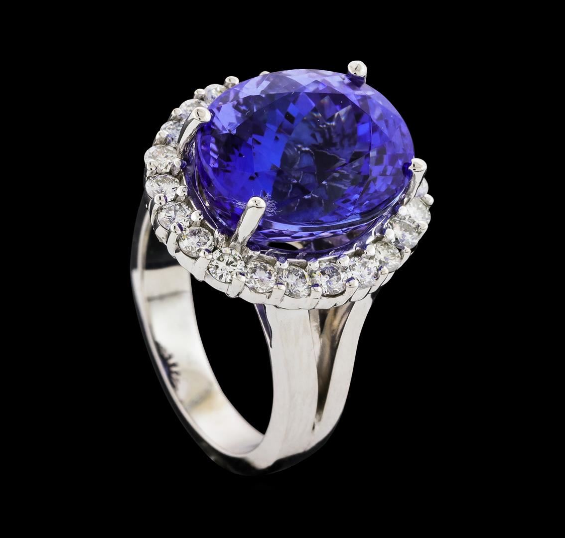 One electronically tested 14KT white gold lady's cast fashion ring with a split shank basket halo with a bright polish finish. The featured lady's ring has a shank measuring 3.50 millimeters wide. Identified with markings of '14K'. Condition is new, good workmanship. Containing: One prong set oval modified brilliant cut natural tanzanite, measuring 14.62 x 12.24 x 10.26mm, (depth est.) 3%. bulge factor, approximate weight of 13.23ct., clarity is eye clean, medium dark, moderately strong, violetish blue color, (GIA vB 6/4), cut is very good. Transmitting light with no distortion, transparent. Colored gemstones are presumed to have been subjected to commonly used enhancement processes. Graded loose prior to setting in the GIA Laboratory, Report #5172847714. Twenty-Two prong set round brilliant cut diamonds, measuring 2.40 - 2.30 x 1.41mm (depth est.) approximate total weight of 22 Stones = 1.03ct. Graded in the setting. Clarity SI-1 to SI-2. Color: H - I Cut Good. Total Weight of Colored Stones 13.23ct.. Total Weight of Diamonds 1.03ct.. Total Weight of Ring 11.80gm. GAS Appraised at $23,760.00.