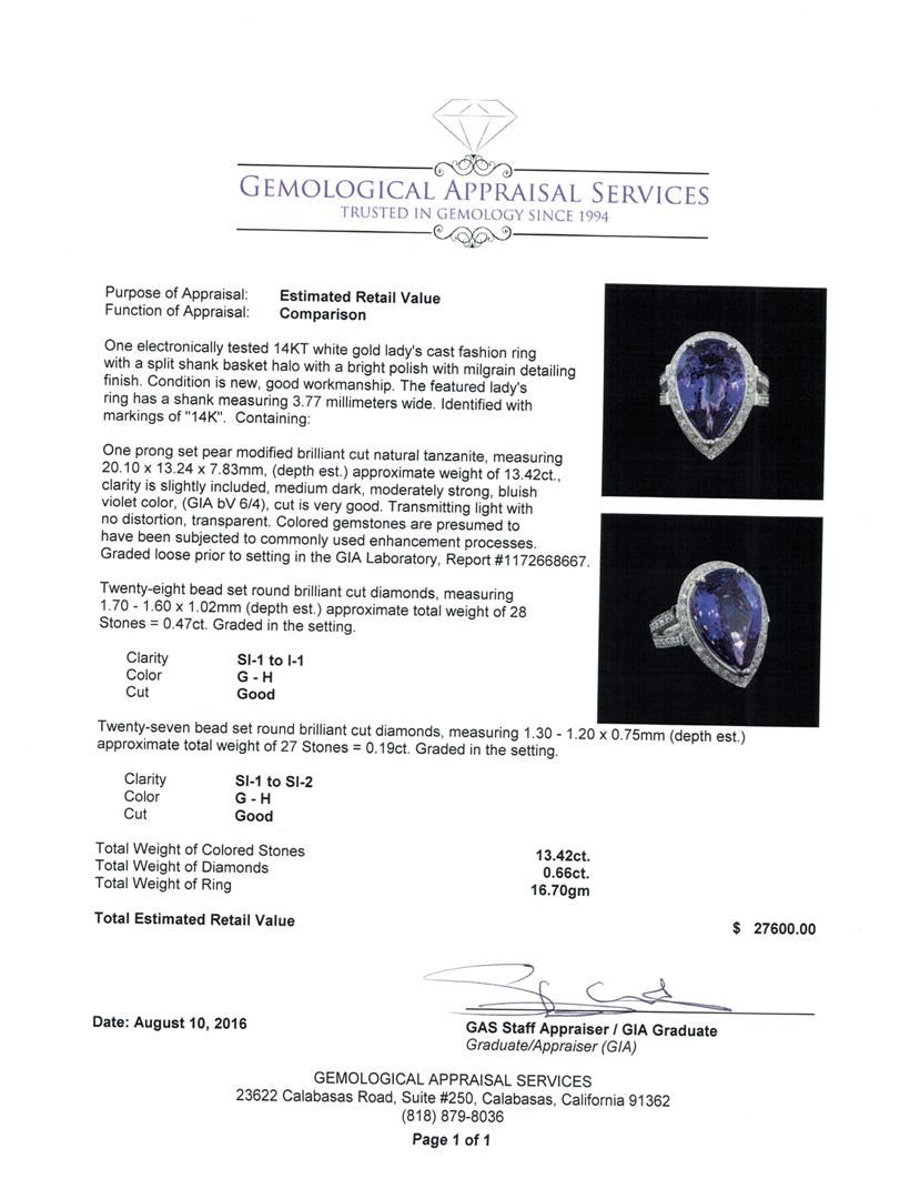One electronically tested 14KT white gold lady's cast fashion ring with a split shank basket halo with a bright polish with milgrain detailing finish. The featured lady's ring has a shank measuring 3.77 millimeters wide. Identified with markings of '14K'. Condition is new, good workmanship. Containing: One prong set pear modified brilliant cut natural tanzanite, measuring 20.10 x 13.24 x 7.83mm, (depth est.) approximate weight of 13.42ct., clarity is slightly included, medium dark, moderately strong, bluish violet color, (GIA bV 6/4), cut is very good. Transmitting light with no distortion, transparent. Colored gemstones are presumed to have been subjected to commonly used enhancement processes. Graded loose prior to setting in the GIA Laboratory, Report #1172668667. Twenty-Eight bead set round brilliant cut diamonds, measuring 1.70 - 1.60 x 1.02mm (depth est.) approximate total weight of 28 Stones = 0.47ct. Graded in the setting. Clarity SI-1 to I-1. Color: G - H Cut Good Twenty-Seven bead set round brilliant cut diamonds, measuring 1.30 - 1.20 x 0.75mm (depth est.) approximate total weight of 27 Stones = 0.19ct. Graded in the setting. Clarity SI-1 to SI-2. Color: G - H Cut Good. Total Weight of Colored Stones 13.42ct.. Total Weight of Diamonds 0.66ct.. Total Weight of Ring 16.70gm. GAS Appraised at $27,600.00.