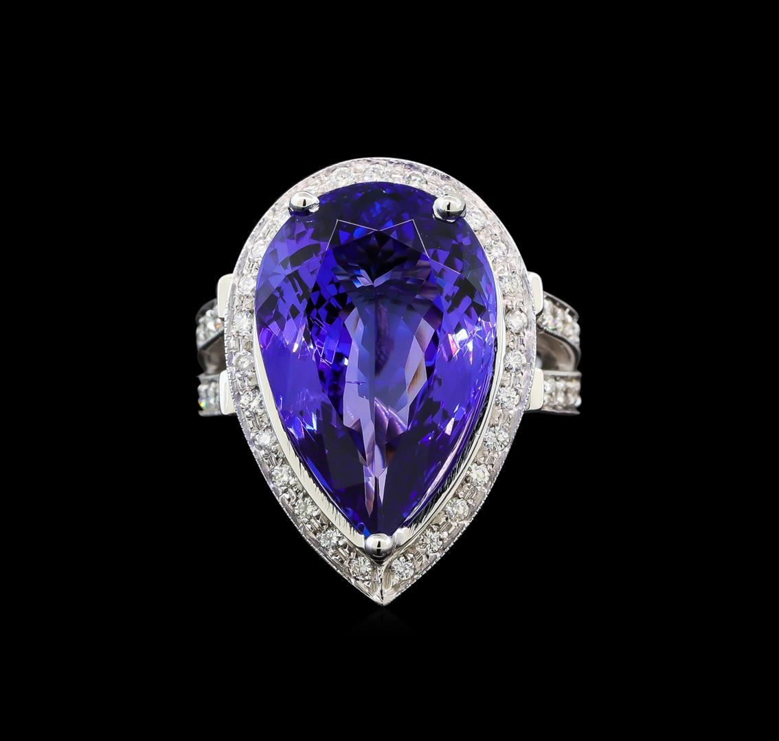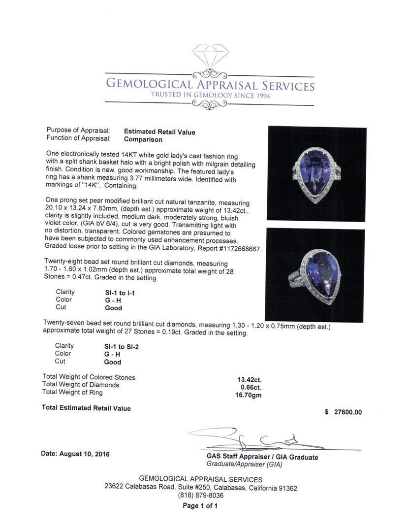 One electronically tested 14KT white gold lady's cast fashion ring with a split shank basket halo with a bright polish with milgrain detailing finish. The featured lady's ring has a shank measuring 3.77 millimeters wide. Identified with markings of '14K'. Condition is new, good workmanship. Containing: One prong set pear modified brilliant cut natural tanzanite, measuring 20.10 x 13.24 x 7.83mm, (depth est.) approximate weight of 13.42ct., clarity is slightly included, medium dark, moderately strong, bluish violet color, (GIA bV 6/4), cut is very good. Transmitting light with no distortion, transparent. Colored gemstones are presumed to have been subjected to commonly used enhancement processes. Graded loose prior to setting in the GIA Laboratory, Report #1172668667. Twenty-Eight bead set round brilliant cut diamonds, measuring 1.70 - 1.60 x 1.02mm (depth est.) approximate total weight of 28 Stones = 0.47ct. Graded in the setting. Clarity SI-1 to I-1. Color: G - H Cut Good Twenty-Seven bead set round brilliant cut diamonds, measuring 1.30 - 1.20 x 0.75mm (depth est.) approximate total weight of 27 Stones = 0.19ct. Graded in the setting. Clarity SI-1 to SI-2. Color: G - H Cut Good. Total Weight of Colored Stones 13.42ct.. Total Weight of Diamonds 0.66ct.. Total Weight of Ring 16.70gm. GAS Appraised.