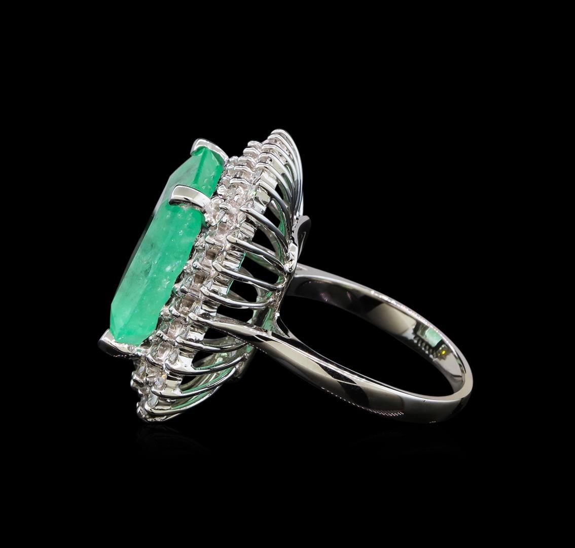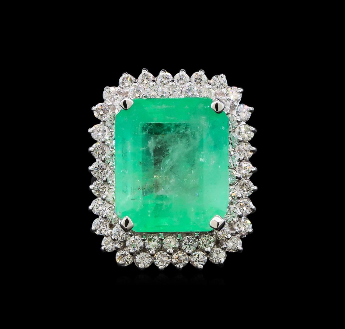 One electronically tested 14KT white gold lady's cast fashion ring with a double basket halo with a bright polish finish. The featured lady's ring has a shank measuring 2.44 millimeters wide. Identified with markings of 'K14'. Condition is new, good workmanship. Containing: One prong set emerald standard step cut natural emerald, measuring 16.24 x 13.77 x 8.36mm, (depth est.) approximate weight of 13.45ct., clarity is heavily included, medium light, moderately strong, green color, (GIA G 4/4), cut is very good. Transmitting light somewhat diffusely, transparent to translucent. Naturally occurring internal & external characteristics are present. Indications of oil residue. Colored gemstones are presumed to have been subjected to commonly used enhancement processes. Graded loose prior to setting in the GIA Laboratory, Report #1172668711. Fifty-Six prong set round brilliant cut diamonds, measuring 2.10 - 2.00 x 1.23mm (depth est.) approximate total weight of 56 Stones = 1.74ct. Graded in the setting. Clarity SI-1 to SI-2. Color: H - I Cut Good. Total Weight of Colored Stones 13.45ct.. Total Weight of Diamonds 1.74ct.. Total Weight of Ring 10.50gm. GAS Appraised at $20,740.00.