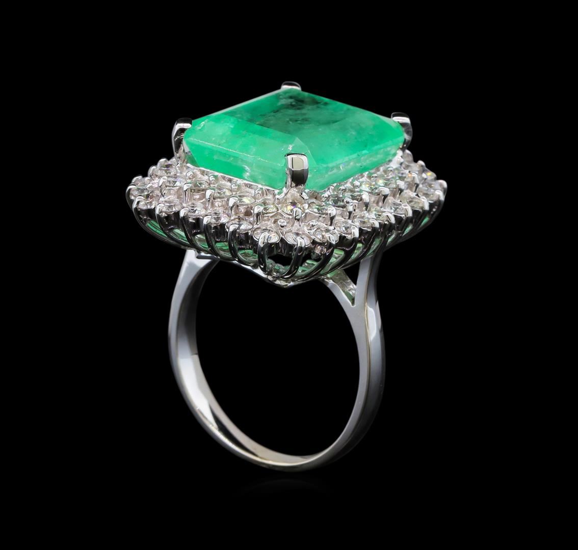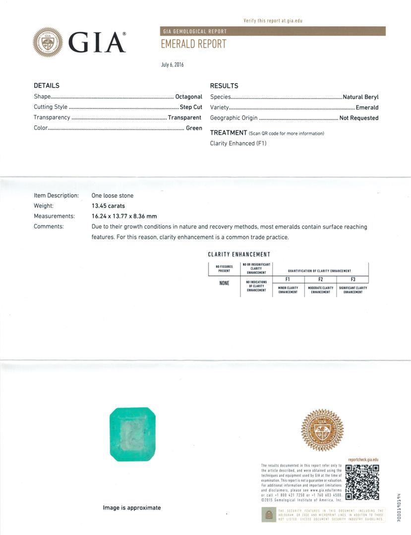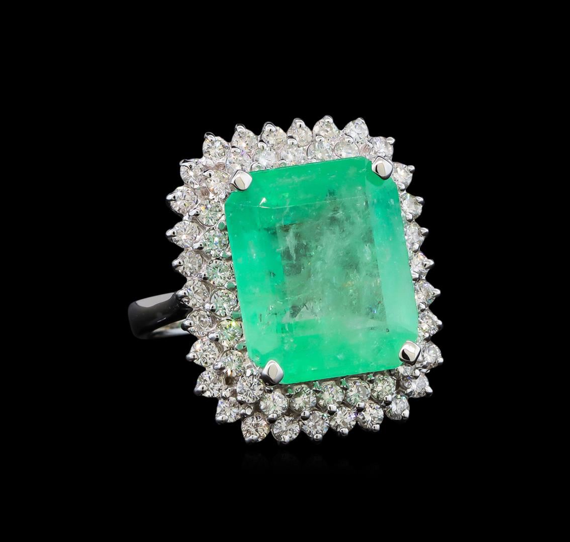 One electronically tested 14KT white gold lady's cast fashion ring with a double basket halo with a bright polish finish. The featured lady's ring has a shank measuring 2.44 millimeters wide. Identified with markings of 'K14'. Condition is new, good workmanship. Containing: One prong set emerald standard step cut natural emerald, measuring 16.24 x 13.77 x 8.36mm, (depth est.) approximate weight of 13.45ct., clarity is heavily included, medium light, moderately strong, green color, (GIA G 4/4), cut is very good. Transmitting light somewhat diffusely, transparent to translucent. Naturally occurring internal & external characteristics are present. Indications of oil residue. Colored gemstones are presumed to have been subjected to commonly used enhancement processes. Graded loose prior to setting in the GIA Laboratory, Report #1172668711. Fifty-Six prong set round brilliant cut diamonds, measuring 2.10 - 2.00 x 1.23mm (depth est.) approximate total weight of 56 Stones = 1.74ct. Graded in the setting. Clarity SI-1 to SI-2. Color: H - I Cut Good. Total Weight of Colored Stones 13.45ct.. Total Weight of Diamonds 1.74ct.. Total Weight of Ring 10.50gm. GAS Appraised at $20,740.00.