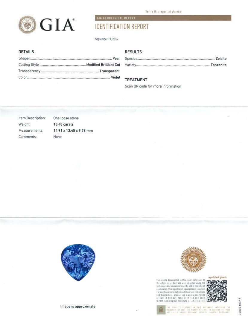 One electronically tested 14KT white gold lady's cast fashion ring with a scalloped basket halo with a bright polish finish. The featured lady's ring has a shank measuring 2.29 millimeters wide. Identified with markings of 'K14'. Condition is new, good workmanship. Containing: One prong set pear modified brilliant cut natural tanzanite, measuring 14.91 x 13.45 x 9.78mm, (depth est.) 3%. bulge factor, approximate weight of 13.48ct., clarity is eye clean, medium, moderately strong, violet color, (GIA V 5/4), cut is very good. Transmitting light with no distortion, transparent. Colored gemstones are presumed to have been subjected to commonly used enhancement processes. Graded loose prior to setting in the GIA Laboratory, Report #6177847835. Twenty-Five prong set round brilliant cut diamonds, measuring 1.80 - 1.75 x 1.10mm (depth est.) approximate total weight of 25 Stones = 0.55ct. Graded in the setting. Clarity SI-1 to SI-2. Color: H - I Cut Good. Total Weight of Colored Stones 13.48ct.. Total Weight of Diamonds 0.55ct.. Total Weight of Ring 9.90gm. GAS Appraised.