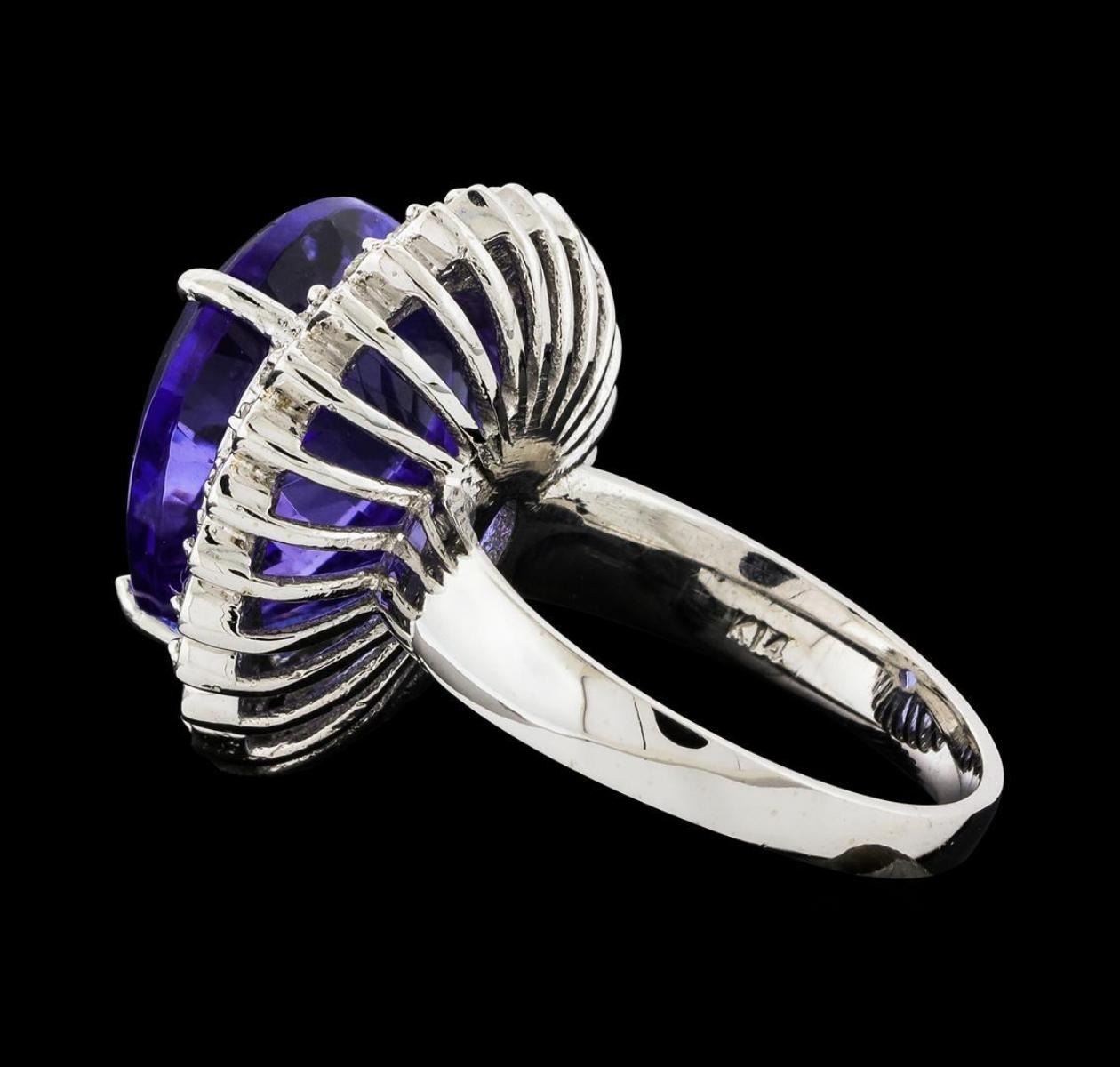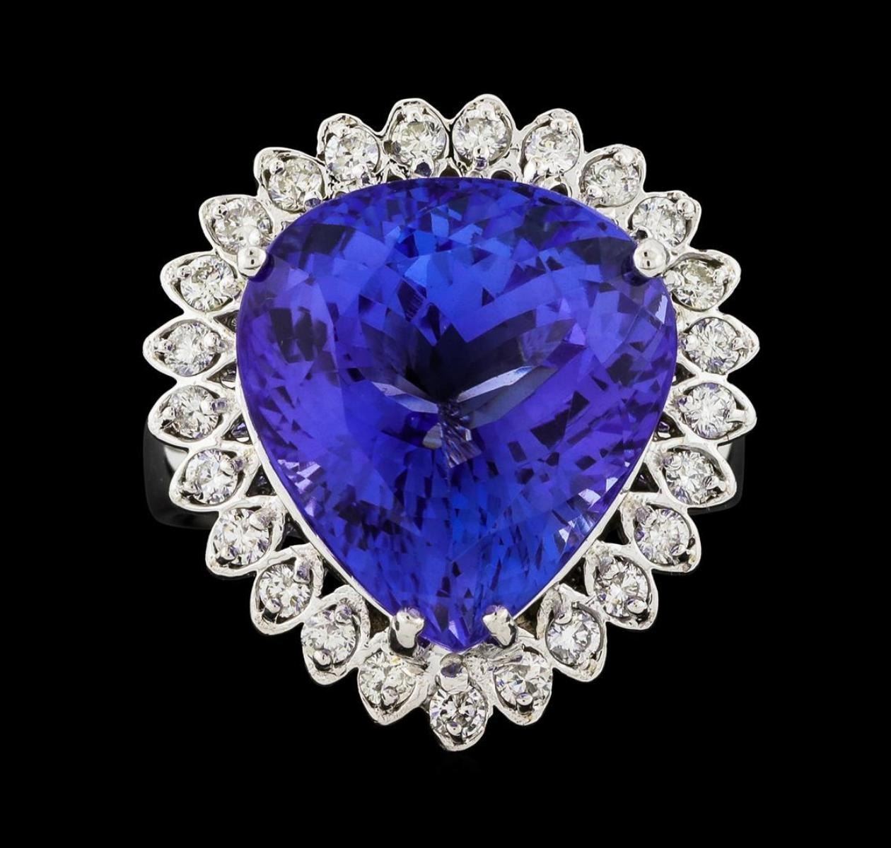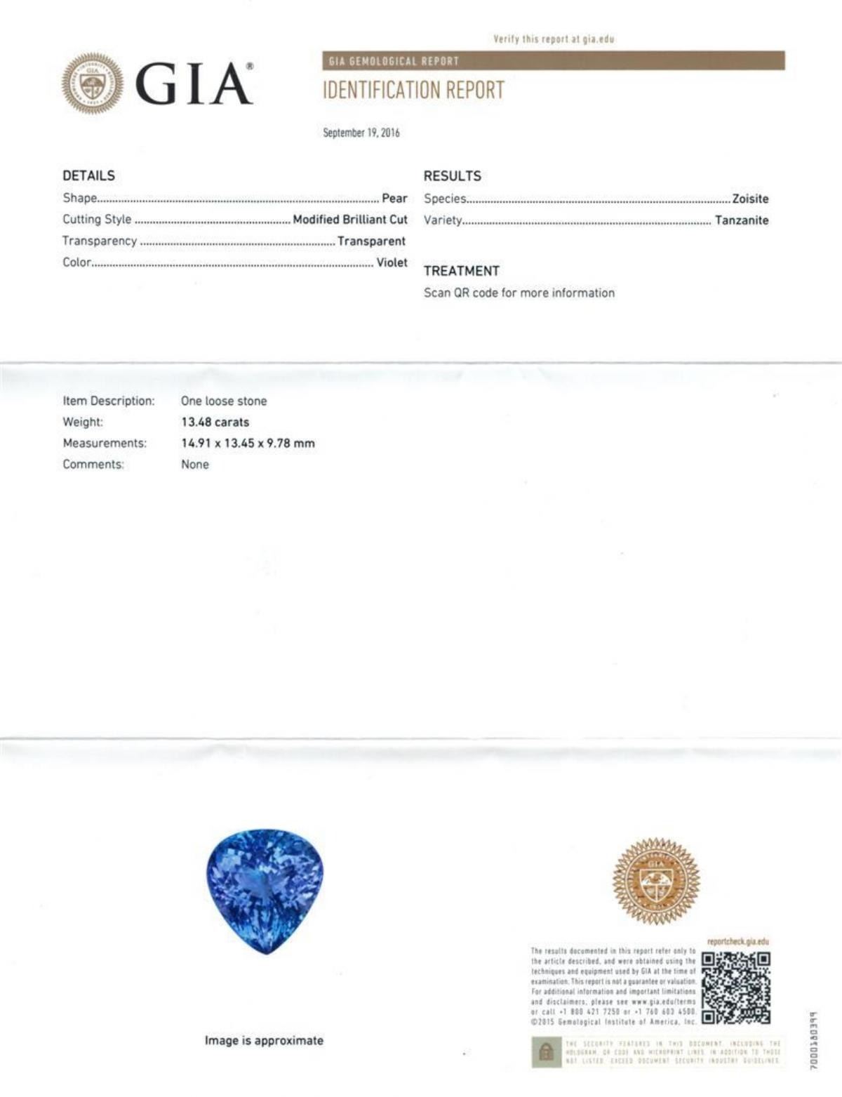 One electronically tested 14KT white gold lady's cast fashion ring with a scalloped basket halo with a bright polish finish. The featured lady's ring has a shank measuring 2.29 millimeters wide. Identified with markings of 'K14'. Condition is new, good workmanship. Containing: One prong set pear modified brilliant cut natural tanzanite, measuring 14.91 x 13.45 x 9.78mm, (depth est.) 3%. bulge factor, approximate weight of 13.48ct., clarity is eye clean, medium, moderately strong, violet color, (GIA V 5/4), cut is very good. Transmitting light with no distortion, transparent. Colored gemstones are presumed to have been subjected to commonly used enhancement processes. Graded loose prior to setting in the GIA Laboratory, Report #6177847835. Twenty-Five prong set round brilliant cut diamonds, measuring 1.80 - 1.75 x 1.10mm (depth est.) approximate total weight of 25 Stones = 0.55ct. Graded in the setting. Clarity SI-1 to SI-2. Color: H - I Cut Good. Total Weight of Colored Stones 13.48ct.. Total Weight of Diamonds 0.55ct.. Total Weight of Ring 9.90gm. GAS Appraised.