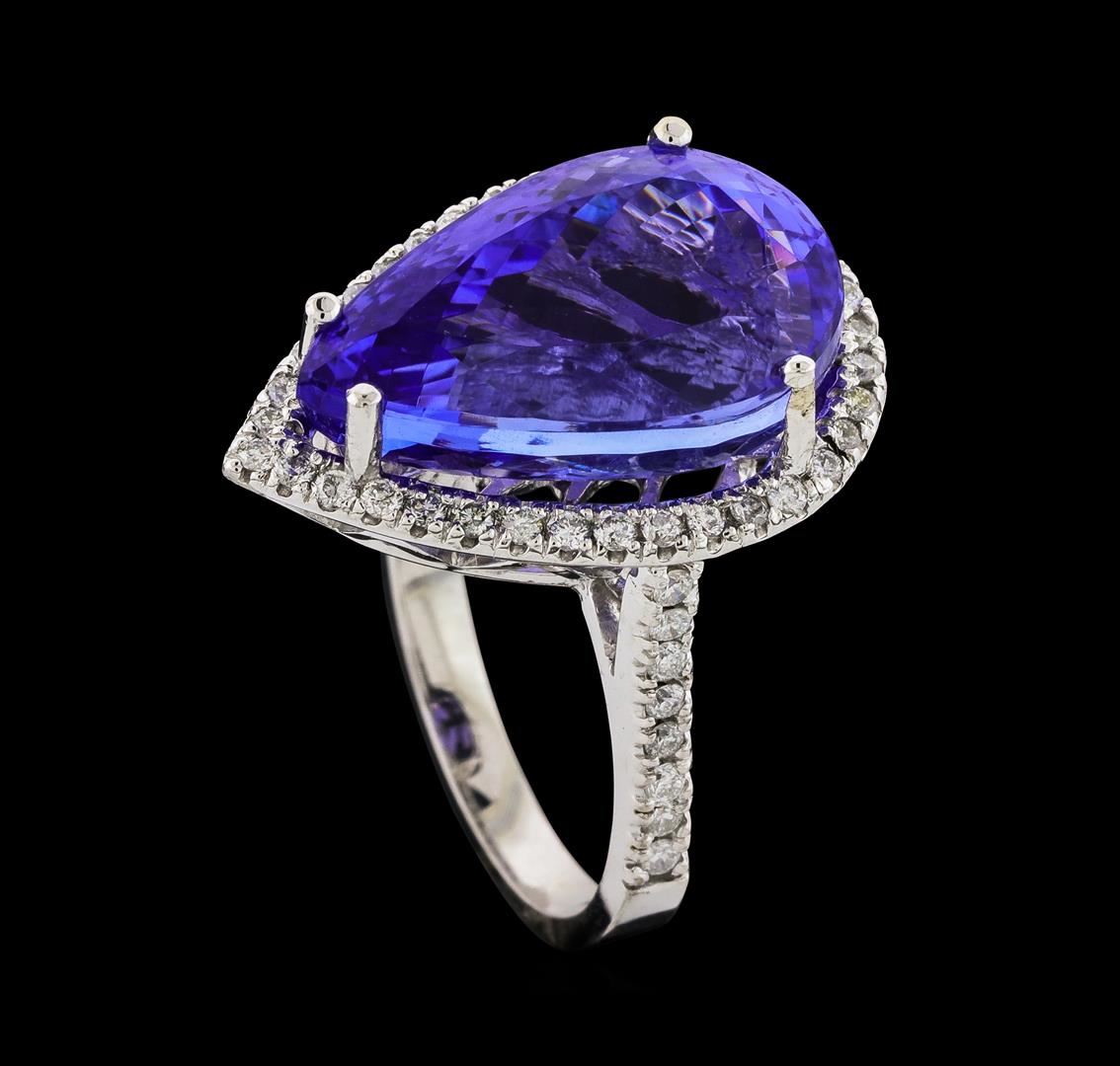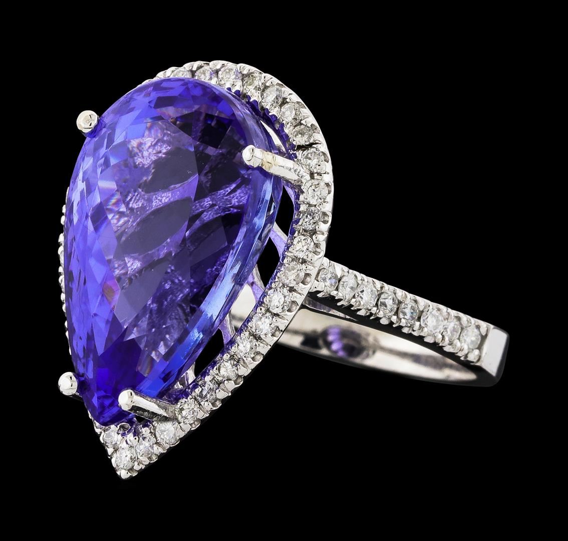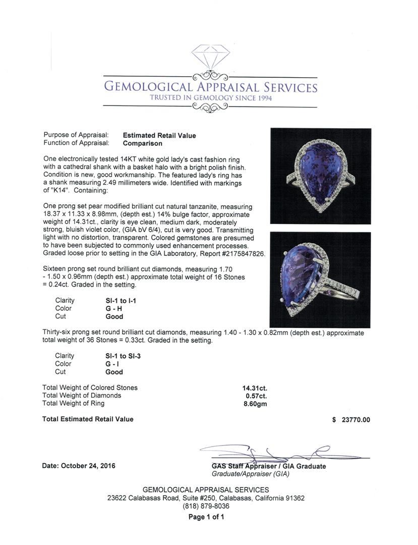 One electronically tested 14KT white gold lady's cast fashion ring with a cathedral shank with a basket halo with a bright polish finish. The featured lady's ring has a shank measuring 2.49 millimeters wide. Identified with markings of 'K14'. Condition is new, good workmanship. Containing: One prong set pear modified brilliant cut natural tanzanite, measuring 18.37 x 11.33 x 8.98mm, (depth est.) 14%. bulge factor, approximate weight of 14.31ct., clarity is eye clean, medium dark, moderately strong, bluish violet color, (GIA bV 6/4), cut is very good. Transmitting light with no distortion, transparent. Colored gemstones are presumed to have been subjected to commonly used enhancement processes. Graded loose prior to setting in the GIA Laboratory, Report #2175847826. Sixteen prong set round brilliant cut diamonds, measuring 1.70 - 1.50 x 0.96mm (depth est.) approximate total weight of 16 Stones = 0.24ct. Graded in the setting. Clarity SI-1 to I-1. Color: G - H Cut Good Thirty-Six prong set round brilliant cut diamonds, measuring 1.40 - 1.30 x 0.82mm (depth est.) approximate total weight of 36 Stones = 0.33ct. Graded in the setting. Clarity SI-1 to SI-3. Color: G - I Cut Good. Total Weight of Colored Stones 14.31ct.. Total Weight of Diamonds 0.57ct.. Total Weight of Ring 8.60gm. GAS Appraised at $23,770.00.