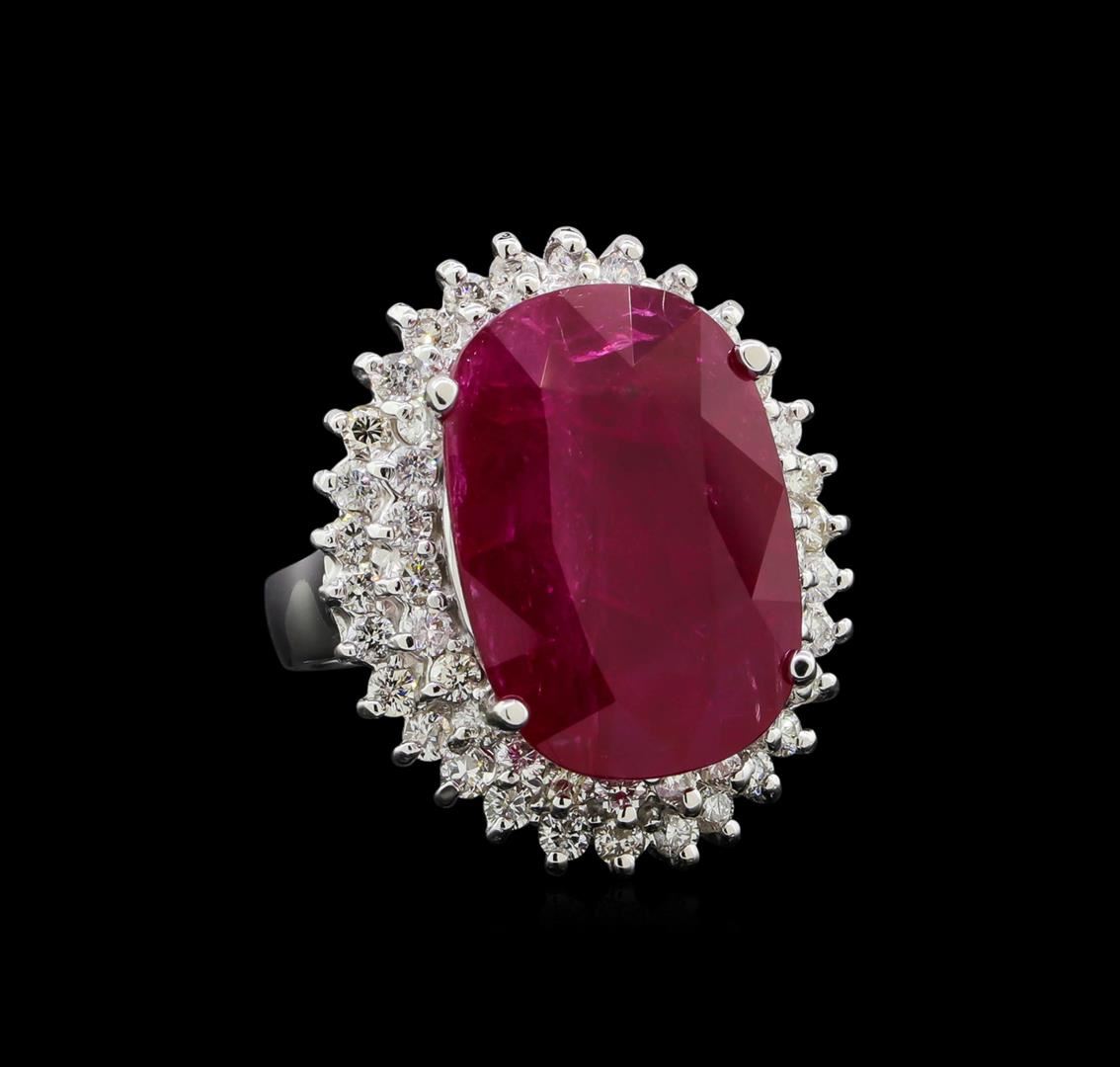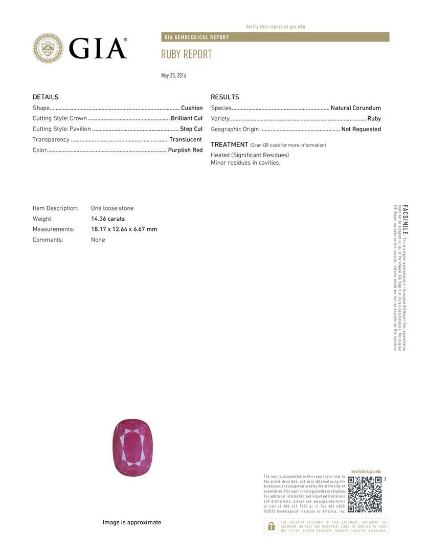 One electronically tested 14KT white gold lady's cast fashion ring with a double basket halo with a bright polish finish. The featured lady's ring has a shank measuring 3.34 millimeters wide. Identified with markings of '14K'. Condition is new, good workmanship. Containing: One prong set oval modified mixed cut natural ruby, measuring 18.17 x 12.64 x 6.67mm, (depth est.) 11%. bulge factor, approximate weight of 14.36ct., clarity is severely included, medium dark, very slightly brownish, strongly purplish red color, (GIA stpR 6/3), cut is good. Transmitting light somewhat diffusely, semi-transparent to translucent. Naturally occurring internal & external characteristics are present. Colored gemstones are presumed to have been subjected to commonly used enhancement processes. Graded loose prior to setting in the GIA Laboratory, Report #5171603124. Fifty-Six prong set round brilliant cut diamonds, measuring 1.95 - 1.85 x 1.14mm (depth est.) approximate total weight of 56 Stones = 1.40ct. Graded in the setting. Clarity SI-1 to SI-2. Color: G - H Cut Good. Total Weight of Colored Stones 14.36ct.. Total Weight of Diamonds 1.40ct.. Total Weight of Ring 10.00gm. GAS Appraised at $30,585.00.