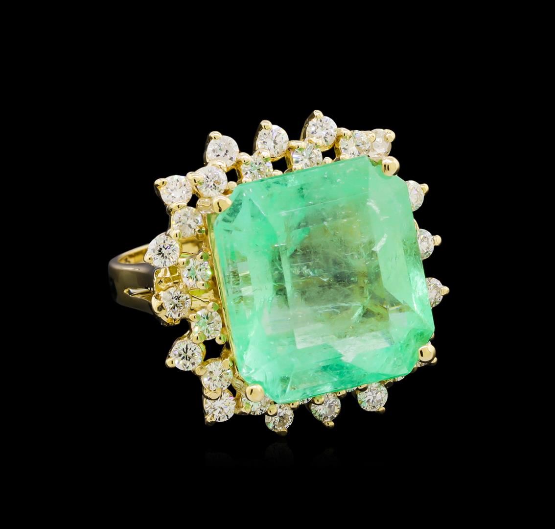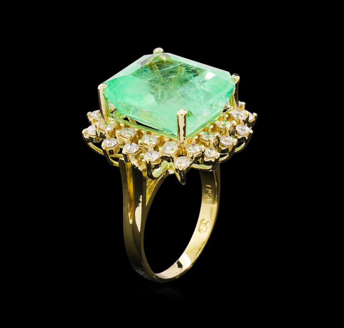One electronically tested 14KT yellow gold lady's cast fashion ring with a double basket halo with a bright polish finish. The featured lady's ring has a shank measuring 2.30 millimeters wide. Identified with markings of "K14". Condition is new, good workmanship. Containing: One prong set emerald step cut natural emerald, measuring 15.48 x 14.44 x 10.01mm, exact weight 14.44ct., clarity is moderately included, type III, medium light, very slightly grayish, green color, (GIA G 4/3), cut is good. Transmitting light somewhat diffusely, transparent to translucent. Naturally occurring internal & external characteristics are present. Clarity enhanced. Graded loose prior to setting in the GIA Laboratory, Report #2171501558.Thirty-Two prong set round brilliant cut diamonds, measuring 2.20 - 2.10 x 1.33mm (depth est.) approximate total weight of 32 Stones = 1.23ct. Graded in the setting. Clarity: SI-1 to SI-2. Color: H - I. Cut Good. Total Weight of Colored Stones 14.44ct. Total Weight of Diamonds 1.23ct. Total Weight of Ring 9.60gm. GAS Appraised at $11,980.00.