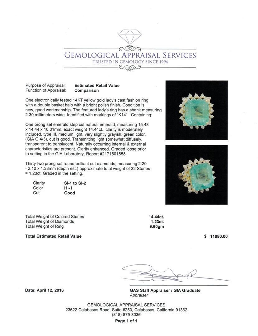 One electronically tested 14KT yellow gold lady's cast fashion ring with a double basket halo with a bright polish finish. The featured lady's ring has a shank measuring 2.30 millimeters wide. Identified with markings of "K14". Condition is new, good workmanship. Containing: One prong set emerald step cut natural emerald, measuring 15.48 x 14.44 x 10.01mm, exact weight 14.44ct., clarity is moderately included, type III, medium light, very slightly grayish, green color, (GIA G 4/3), cut is good. Transmitting light somewhat diffusely, transparent to translucent. Naturally occurring internal & external characteristics are present. Clarity enhanced. Graded loose prior to setting in the GIA Laboratory, Report #2171501558.Thirty-Two prong set round brilliant cut diamonds, measuring 2.20 - 2.10 x 1.33mm (depth est.) approximate total weight of 32 Stones = 1.23ct. Graded in the setting. Clarity: SI-1 to SI-2. Color: H - I. Cut Good. Total Weight of Colored Stones 14.44ct. Total Weight of Diamonds 1.23ct. Total Weight of Ring 9.60gm. GAS Appraised at $11,980.00.