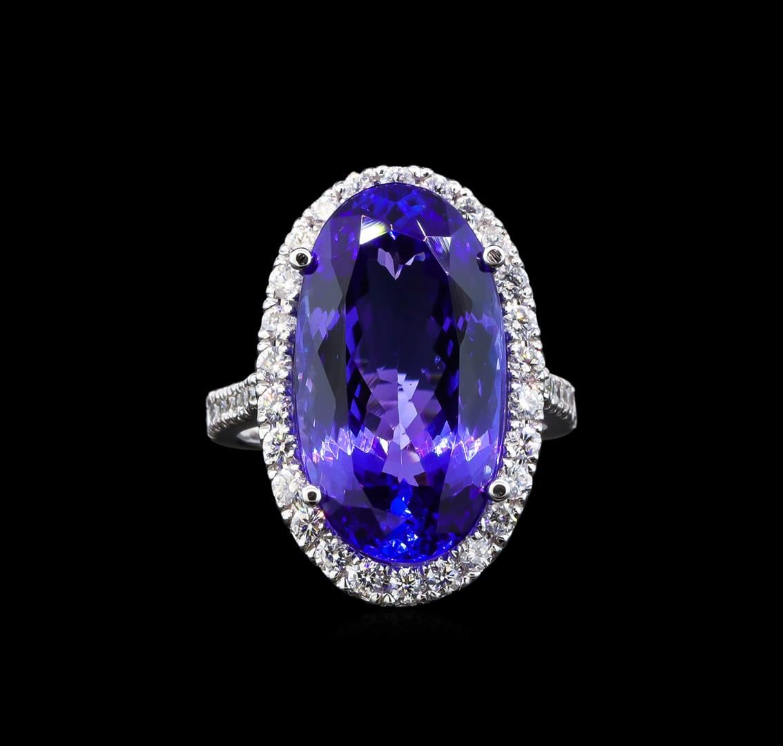 One electronically tested 14KT white gold lady's cast fashion ring with a halo with a bright polish finish. The featured lady's ring has a shank measuring 2.46 millimeters wide. Identified with markings of 'K14'. Condition is new, good workmanship. Containing: One prong set oval modified brilliant cut natural tanzanite, measuring 21.00 x 11.67 x 7.66mm, (depth est.) 10%. bulge factor, approximate weight of 14.53ct., clarity is eye clean, medium dark, strong, bluish violet color, (GIA bV 6/5), cut is very good. Transmitting light with no distortion, transparent. Colored gemstones are presumed to have been subjected to commonly used enhancement processes. Graded loose prior to setting in the GIA Laboratory, Report #5172668761. Forty prong set round brilliant cut diamonds, measuring 1.90 - 1.85 x 1.17mm (depth est.) approximate total weight of 40 Stones = 1.00ct. Graded in the setting. Clarity SI-1 to SI-2. Color: H - I Cut Good. Total Weight of Colored Stones 14.53ct.. Total Weight of Diamonds 1.00ct.. Total Weight of Ring 9.60gm. GAS Appraised at $25,980.00.