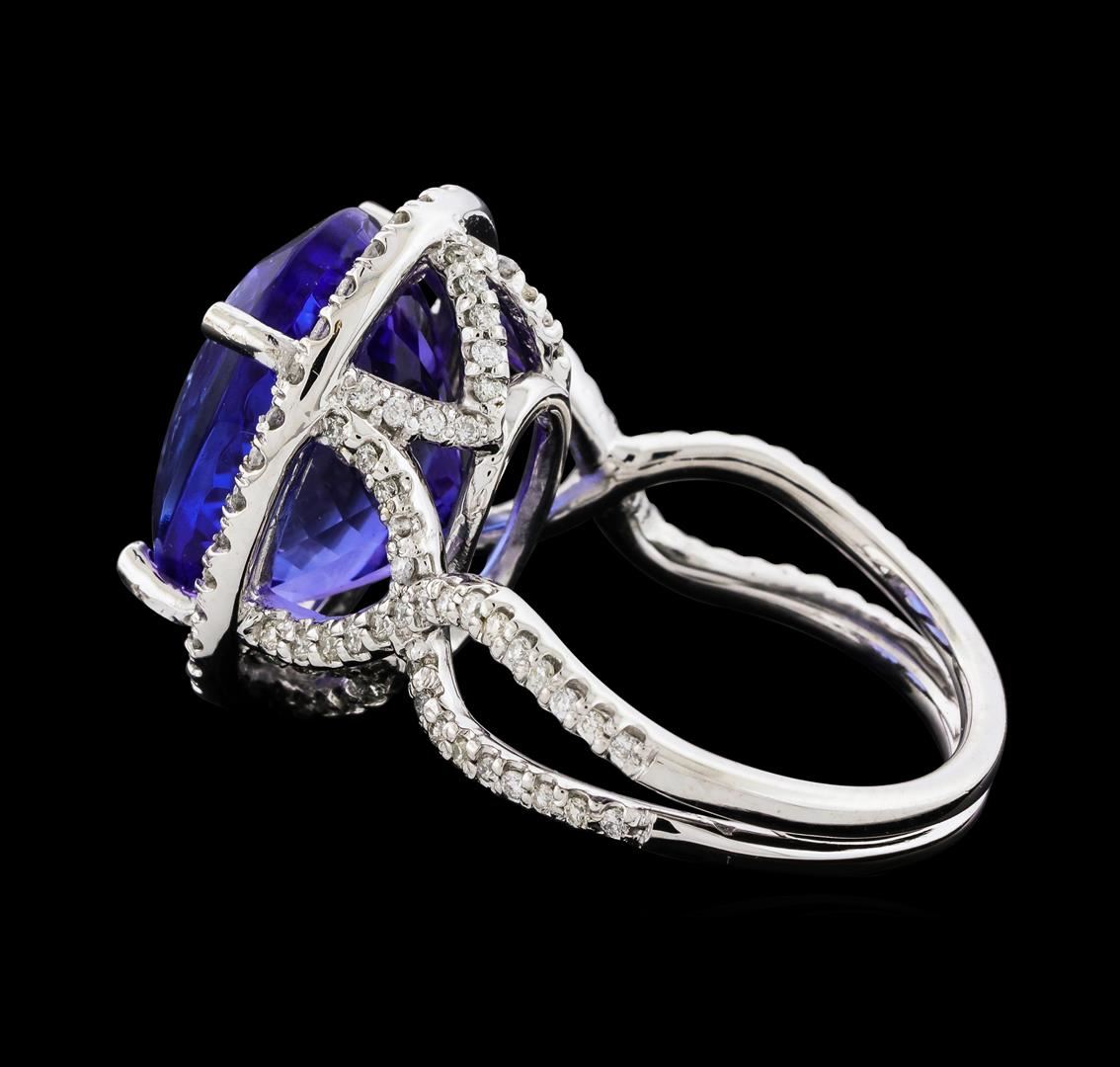 One electronically tested 14KT white gold lady's cast fashion ring with a overlapping split shank with a bright polish finish. The featured lady's ring has a double shank measuring 3.29 millimeters wide. Identified with markings of '14K'. Condition is new, good workmanship. Containing: One prong set oval modified brilliant cut natural tanzanite, measuring 15.79 x 12.04 x 10.24mm, (depth est.) 7%. bulge factor, approximate weight of 14.65ct., clarity is eye clean, medium, moderately strong, violetish blue color, (GIA vB 5/4), cut is excellent. Transmitting light with no distortion, transparent. Colored gemstones are presumed to have been subjected to commonly used enhancement processes. Graded loose prior to setting in the GIA Laboratory, Report #2171847721. One Hundred Twenty-Eight prong set round brilliant cut diamonds, measuring 1.20 - 1.10 x 0.71mm (depth est.) approximate total weight of 128 Stones = 0.73ct. Graded in the setting. Clarity SI-1 to I-1. Color: G - H Cut Good. Total Weight of Colored Stones 14.65ct.. Total Weight of Diamonds 0.73ct.. Total Weight of Ring 10.40gm. GAS Appraised at $25,150.00.