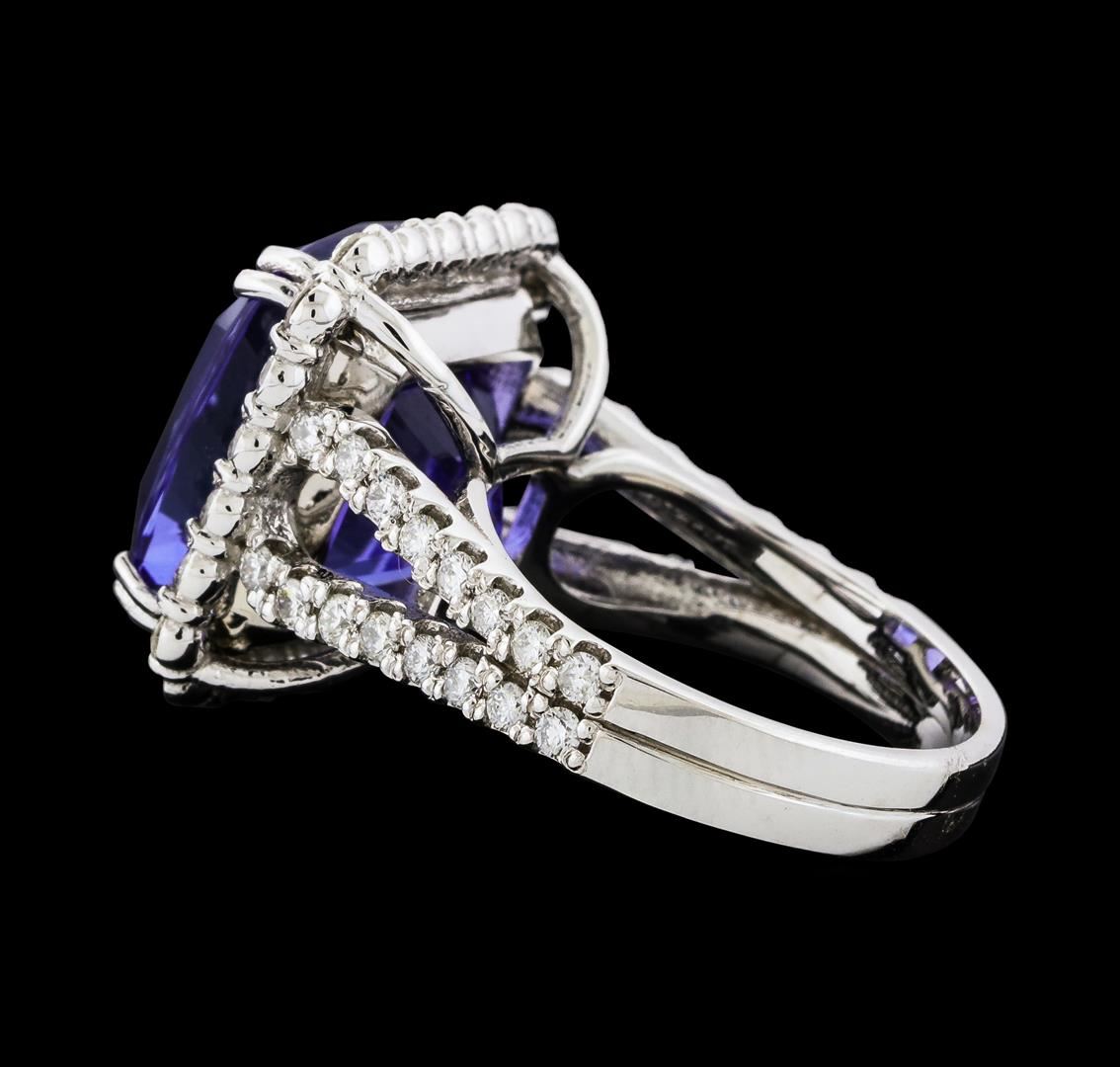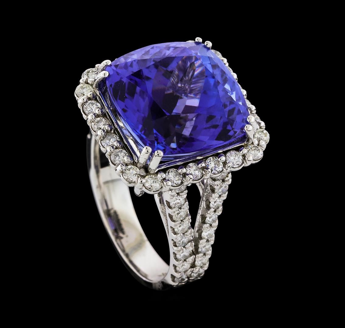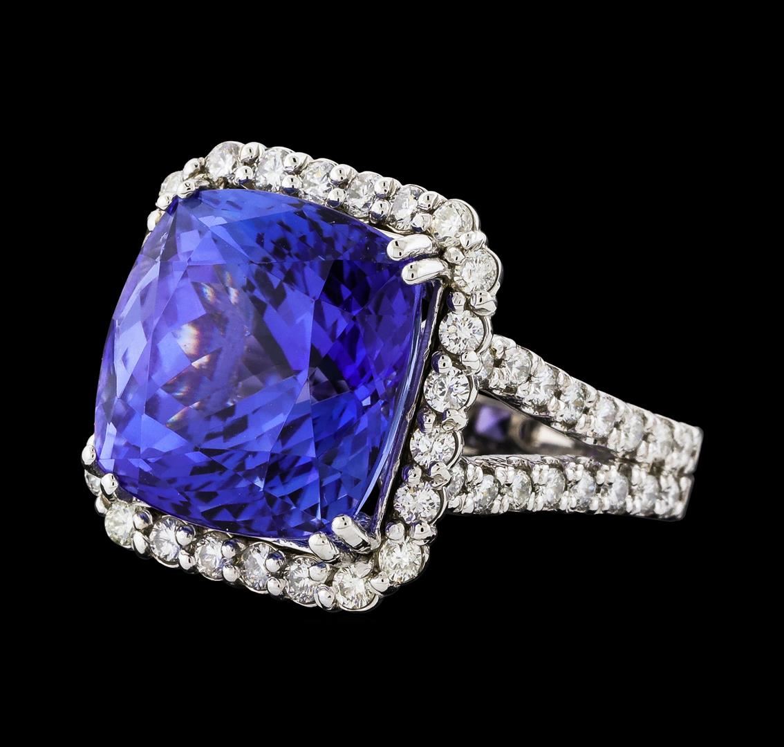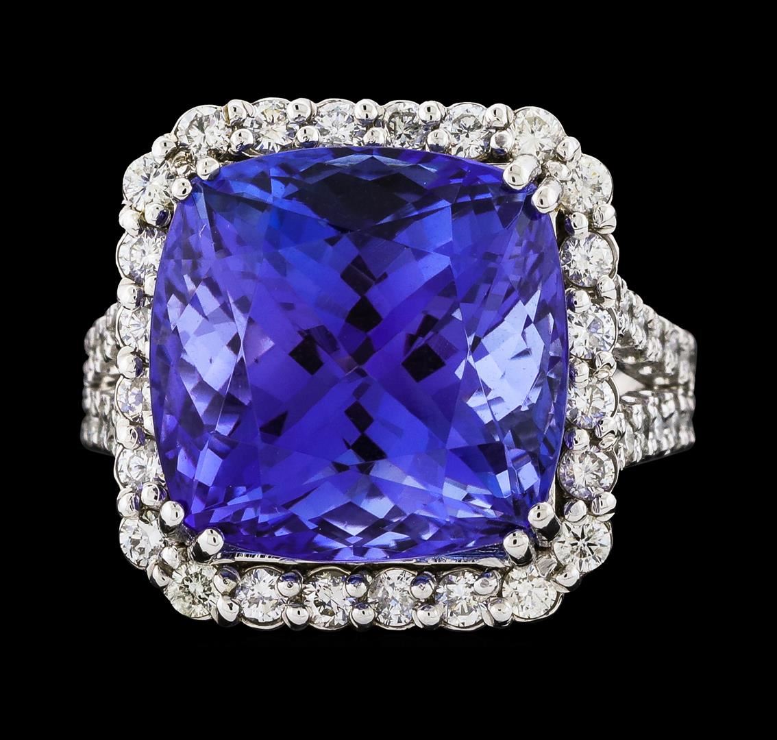 One electronically tested 14KT white gold lady's cast fashion ring with a split shank basket halo with a bright polish finish. The featured lady's ring has a double shank measuring 3.68 millimeters wide. Identified with markings of 'K14'. Condition is new, good workmanship. Containing: One prong set square cushion modified brilliant cut natural tanzanite, measuring 13.85 x 13.81 x 10.80mm, (depth est.) approximate weight of 14.91ct., clarity is eye clean, medium, moderately strong, violet color, (GIA V 5/4), cut is very good. Transmitting light with no distortion, transparent. Colored gemstones are presumed to have been subjected to commonly used enhancement processes. Graded loose prior to setting in the GIA Laboratory, Report #5171847054. Twenty-Four prong set round brilliant cut diamonds, measuring 2.00 - 1.90 x 1.17mm (depth est.) approximate total weight of 24 Stones = 0.65ct. Graded in the setting. Clarity SI-1 to I-1. Color: H - I Cut Good Thirty-Two prong set round brilliant cut diamonds, measuring 1.70 - 1.60 x 0.99mm (depth est.) approximate total weight of 32 Stones = 0.52ct. Graded in the setting. Clarity SI-1 to I-1. Color: H - I Cut Good. Total Weight of Colored Stones 14.91ct.. Total Weight of Diamonds 1.17ct.. Total Weight of Ring 10.80gm. GAS Appraised at $23,755.00.