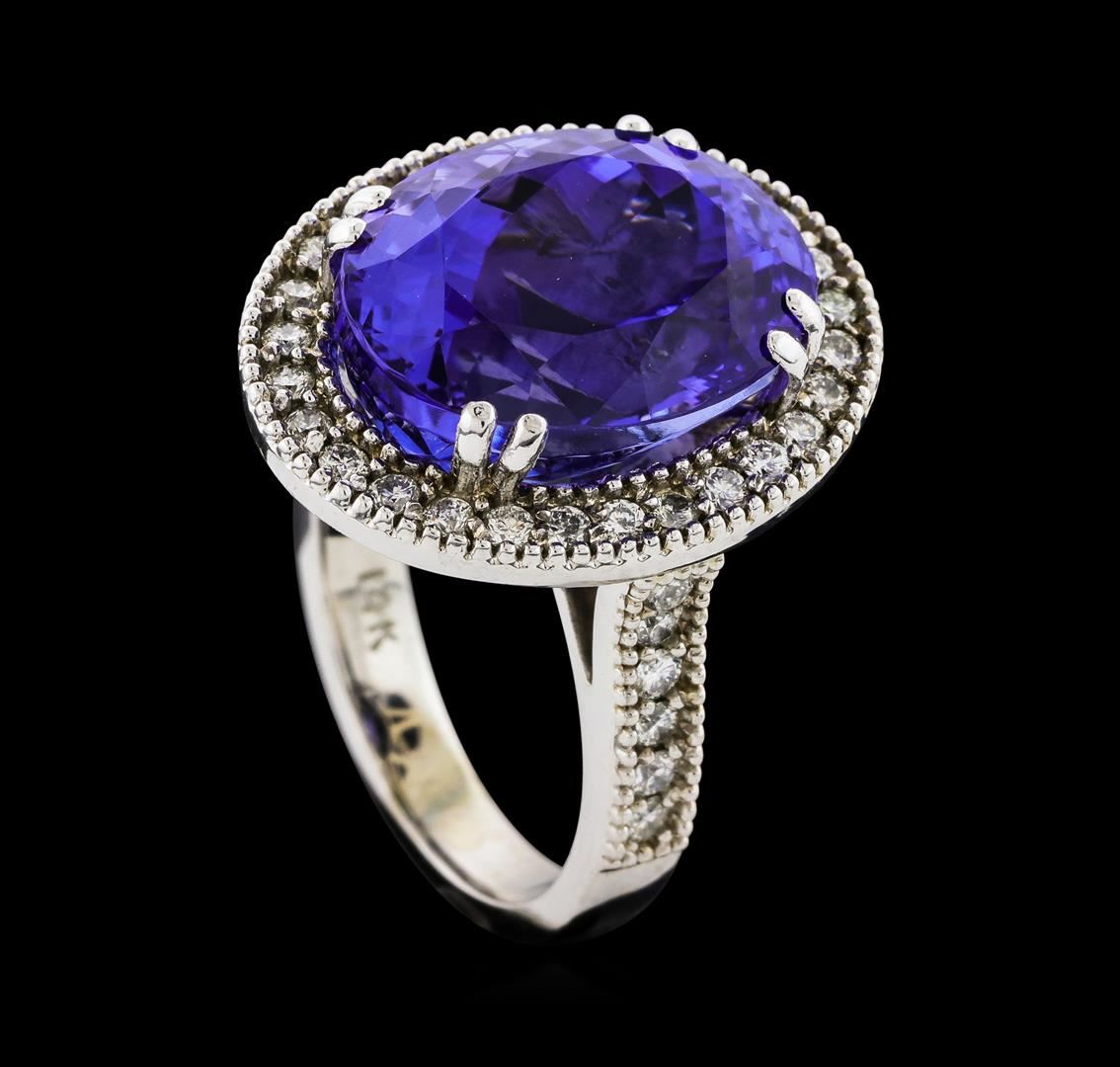 One electronically tested 14KT white gold lady's cast fashion ring with a basket halo with a bright polish with milgrain detailing finish. The featured lady's ring has a shank measuring 3.26 millimeters wide. Identified with markings of '14K'. Condition is new, good workmanship. Containing: One prong set oval modified brilliant cut natural tanzanite, measuring 15.83 x 12.49 x 10.19mm, (depth est.) 9%. bulge factor, approximate weight of 15.48ct., clarity is eye clean, medium dark, moderately strong, violet color, (GIA V 6/4), cut is very good. Transmitting light with no distortion, transparent. Colored gemstones are presumed to have been subjected to commonly used enhancement processes. Graded loose prior to setting in the GIA Laboratory, Report #2171847702. Forty prong set round brilliant cut diamonds, measuring 1.80 - 1.70 x 1.09mm (depth est.) approximate total weight of 40 Stones = 0.83ct. Graded in the setting. Clarity SI-1 to SI-2. Color: H - I Cut Good. Total Weight of Colored Stones 15.48ct.. Total Weight of Diamonds 0.83ct.. Total Weight of Ring 12.10gm. GAS Appraised at $25,610.00.