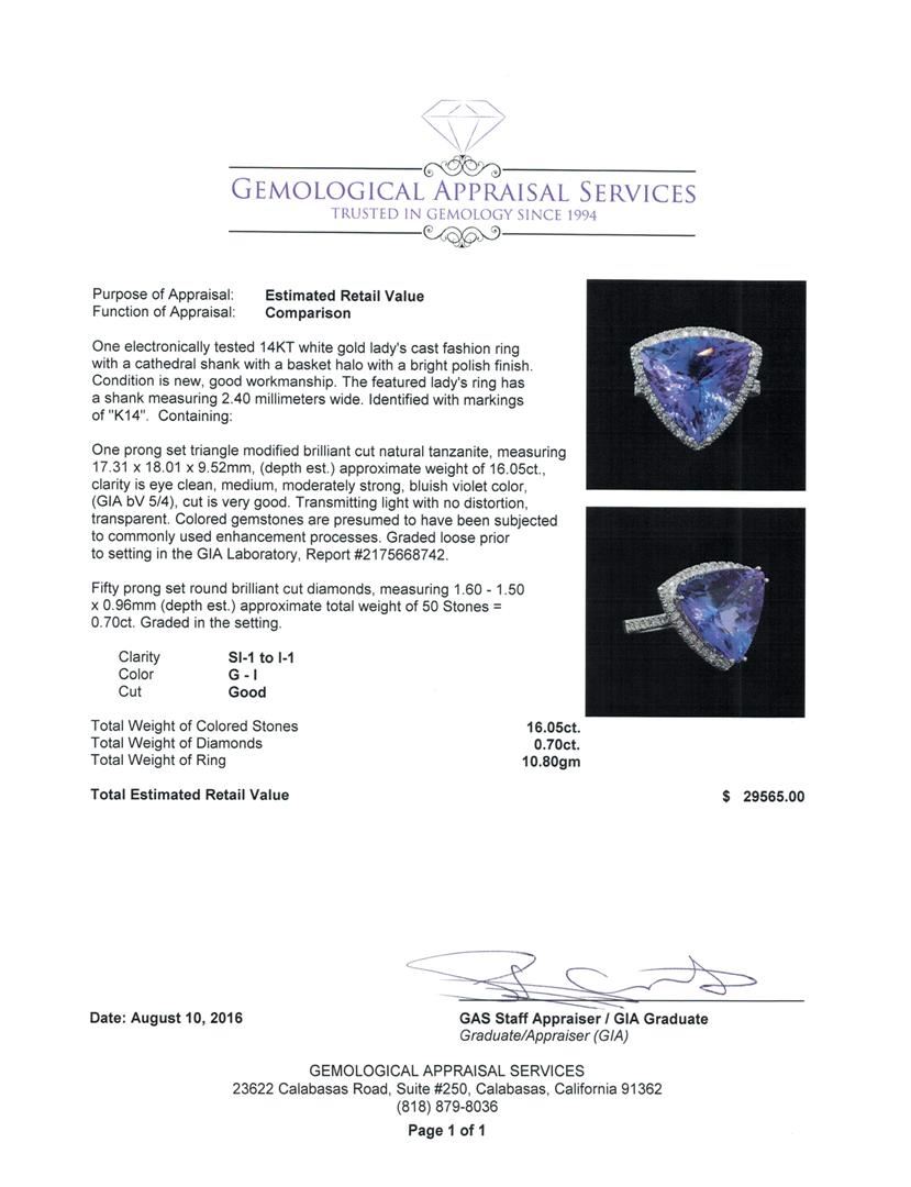 One electronically tested 14KT white gold lady's cast fashion ring with a cathedral shank with a basket halo with a bright polish finish. The featured lady's ring has a shank measuring 2.40 millimeters wide. Identified with markings of 'K14'. Condition is new, good workmanship. Containing: One prong set triangle modified brilliant cut natural tanzanite, measuring 17.31 x 18.01 x 9.52mm, (depth est.) approximate weight of 16.05ct., clarity is eye clean, medium, moderately strong, bluish violet color, (GIA bV 5/4), cut is very good. Transmitting light with no distortion, transparent. Colored gemstones are presumed to have been subjected to commonly used enhancement processes. Graded loose prior to setting in the GIA Laboratory, Report #2175668742. Fifty prong set round brilliant cut diamonds, measuring 1.60 - 1.50 x 0.96mm (depth est.) approximate total weight of 50 Stones = 0.70ct. Graded in the setting. Clarity SI-1 to I-1. Color: G - I Cut Good. Total Weight of Colored Stones 16.05ct.. Total Weight of Diamonds 0.70ct.. Total Weight of Ring 10.80gm. GAS Appraised at $29,565.00.