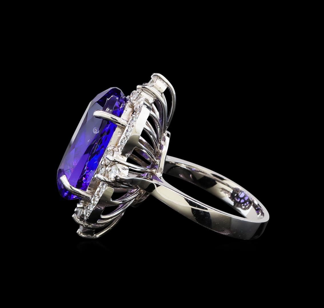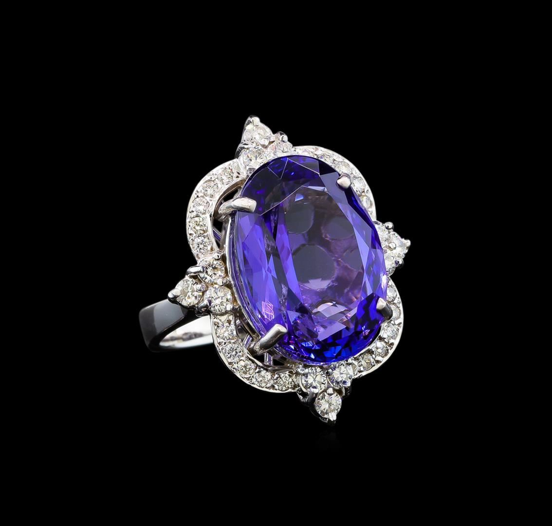 One electronically tested 14KT white gold lady's cast fashion ring with a basket halo with a bright polish finish. The featured lady's ring has a shank measuring 3.15 millimeters wide. Identified with markings of '14K'. Condition is new, good workmanship. Containing: One prong set oval modified brilliant cut natural tanzanite, measuring 18.72 x 13.01 x 8.54mm, (depth est.) 12%. bulge factor, approximate weight of 16.34ct., clarity is eye clean, medium dark, moderately strong, violet color, (GIA V 6/4), cut is very good. Transmitting light with no distortion, transparent. Colored gemstones are presumed to have been subjected to commonly used enhancement processes. Graded loose prior to setting in the GIA Laboratory, Report #2175668674. Twelve prong set round brilliant cut diamonds, measuring 2.50 - 2.40 x 1.47mm (depth est.) approximate total weight of 12 Stones = 0.63ct. Graded in the setting. Clarity SI-1 to I-1. Color: H - I Cut Good Twenty bead set round brilliant cut diamonds, measuring 1.50 - 1.40 x 0.90mm (depth est.) approximate total weight of 20 Stones = 0.23ct. Graded in the setting. Clarity SI-1 to SI-2. Color: H - I Cut Good. Total Weight of Colored Stones 16.34ct.. Total Weight of Diamonds 0.86ct.. Total Weight of Ring 12.40gm. GAS Appraised at $26,940.00.