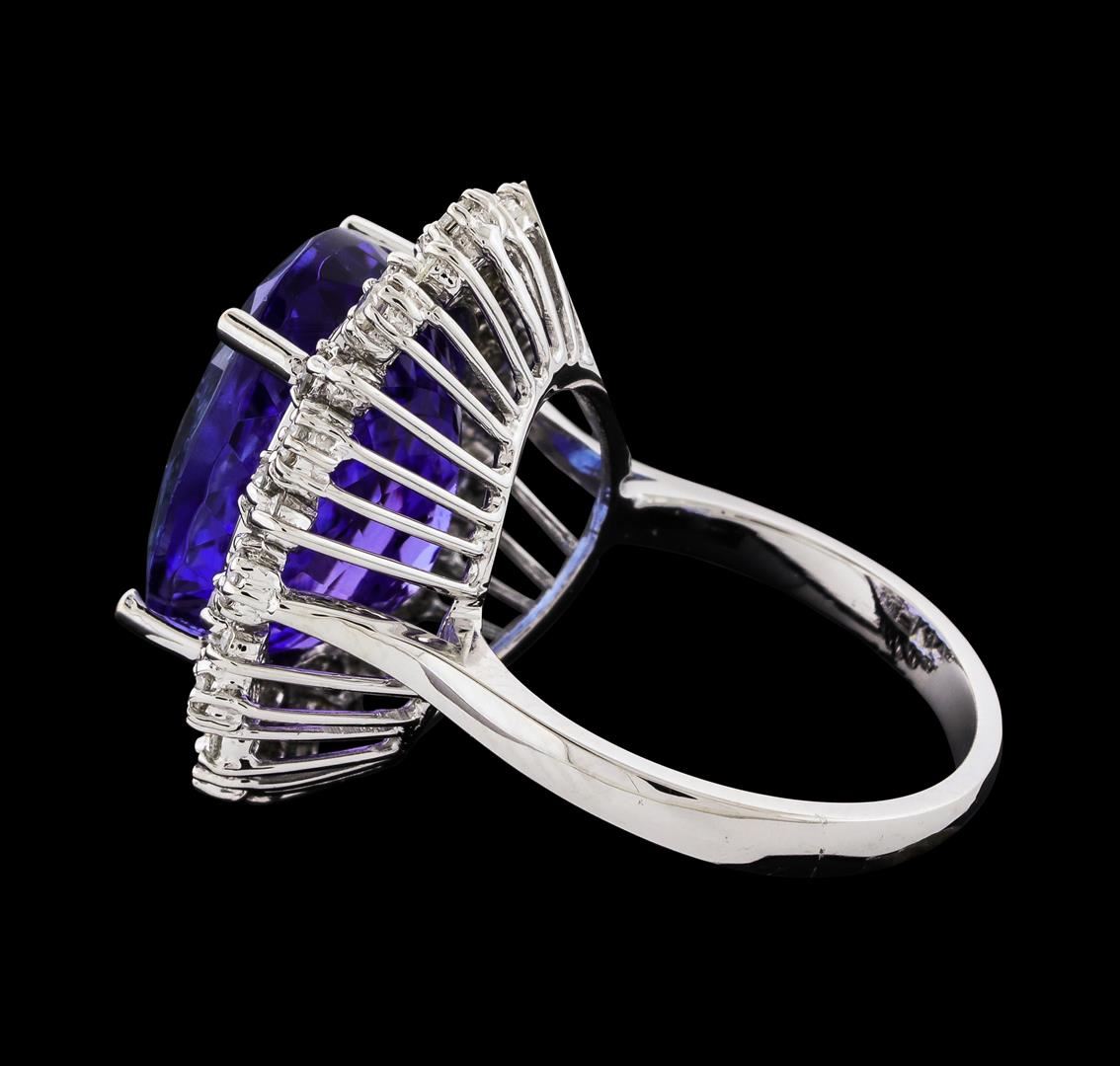 One electronically tested 14KT white gold lady's cast fashion ring with a double basket halo with a bright polish finish. The featured lady's ring has a shank measuring 2.46 millimeters wide. Identified with markings of 'K14'. Condition is new, good workmanship. Containing: One prong set oval modified brilliant cut natural tanzanite, measuring 16.43 x 12.89 x 9.38mm, (depth est.) 18%. bulge factor, approximate weight of 16.52ct., clarity is eye clean, medium light, very slightly grayish, violetish blue color, (GIA vB 4/3), cut is very good. Transmitting light with no distortion, transparent. Colored gemstones are presumed to have been subjected to commonly used enhancement processes. Graded loose prior to setting in the GIA Laboratory, Report #5171847691. Twelve prong set round brilliant cut diamonds, measuring 2.20 - 2.15 x 1.35mm (depth est.) approximate total weight of 12 Stones = 0.48ct. Graded in the setting. Clarity SI-1 to SI-3. Color: H - I Cut Good Twelve prong set round brilliant cut diamonds, measuring 1.80 - 1.70 x 1.09mm (depth est.) approximate total weight of 12 Stones = 0.25ct. Graded in the setting. Clarity SI-1 to SI-2. Color: H - I Cut Good Twelve prong set round brilliant cut diamonds, measuring 1.50 - 1.40 x 0.90mm (depth est.) approximate total weight of 12 Stones = 0.14ct. Graded in the setting. Clarity SI-1 to SI-3. Color: H - I Cut Good. Total Weight of Colored Stones 16.52ct.. Total Weight of Diamonds 0.87ct.. Total Weight of Ring 10.00gm. GAS Appraised at $20,955.00.
