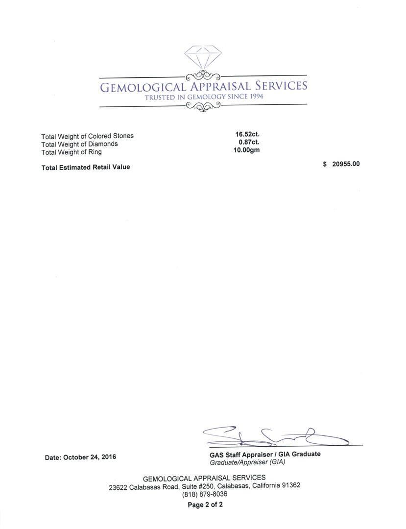 One electronically tested 14KT white gold lady's cast fashion ring with a double basket halo with a bright polish finish. The featured lady's ring has a shank measuring 2.46 millimeters wide. Identified with markings of 'K14'. Condition is new, good workmanship. Containing: One prong set oval modified brilliant cut natural tanzanite, measuring 16.43 x 12.89 x 9.38mm, (depth est.) 18%. bulge factor, approximate weight of 16.52ct., clarity is eye clean, medium light, very slightly grayish, violetish blue color, (GIA vB 4/3), cut is very good. Transmitting light with no distortion, transparent. Colored gemstones are presumed to have been subjected to commonly used enhancement processes. Graded loose prior to setting in the GIA Laboratory, Report #5171847691. Twelve prong set round brilliant cut diamonds, measuring 2.20 - 2.15 x 1.35mm (depth est.) approximate total weight of 12 Stones = 0.48ct. Graded in the setting. Clarity SI-1 to SI-3. Color: H - I Cut Good Twelve prong set round brilliant cut diamonds, measuring 1.80 - 1.70 x 1.09mm (depth est.) approximate total weight of 12 Stones = 0.25ct. Graded in the setting. Clarity SI-1 to SI-2. Color: H - I Cut Good Twelve prong set round brilliant cut diamonds, measuring 1.50 - 1.40 x 0.90mm (depth est.) approximate total weight of 12 Stones = 0.14ct. Graded in the setting. Clarity SI-1 to SI-3. Color: H - I Cut Good. Total Weight of Colored Stones 16.52ct.. Total Weight of Diamonds 0.87ct.. Total Weight of Ring 10.00gm. GAS Appraised.