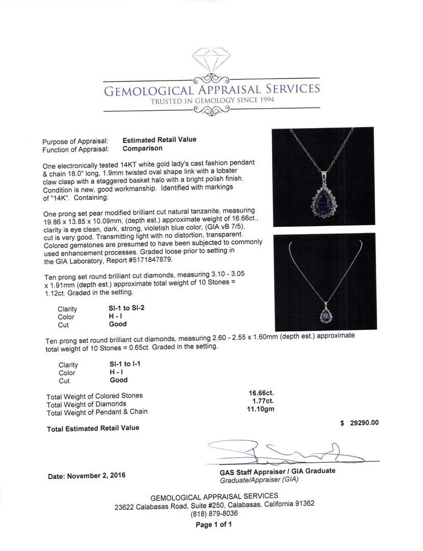 One electronically tested 14KT white gold lady's cast fashion pendant & chain 18.0' long, 1.9mm twisted oval shape link with a lobster claw clasp with a staggered basket halo with a bright polish finish. Identified with markings of '14K'. Condition is new, good workmanship. Containing: One prong set pear modified brilliant cut natural tanzanite, measuring 19.86 x 13.85 x 10.09mm, (depth est.) approximate weight of 16.66ct., clarity is eye clean, dark, strong, violetish blue color, (GIA vB 7/5), cut is very good. Transmitting light with no distortion, transparent. Colored gemstones are presumed to have been subjected to commonly used enhancement processes. Graded loose prior to setting in the GIA Laboratory, Report #5171847879. Ten prong set round brilliant cut diamonds, measuring 3.10 - 3.05 x 1.91mm (depth est.) approximate total weight of 10 Stones = 1.12ct. Graded in the setting. Clarity SI-1 to SI-2. Color: H - I Cut Good Ten prong set round brilliant cut diamonds, measuring 2.60 - 2.55 x 1.60mm (depth est.) approximate total weight of 10 Stones = 0.65ct. Graded in the setting. Clarity SI-1 to I-1. Color: H - I Cut Good. Total Weight of Colored Stones 16.66ct.. Total Weight of Diamonds 1.77ct.. Total Weight of Pendant & Chain 11.10gm. GAS Appraised at $29,290.00.