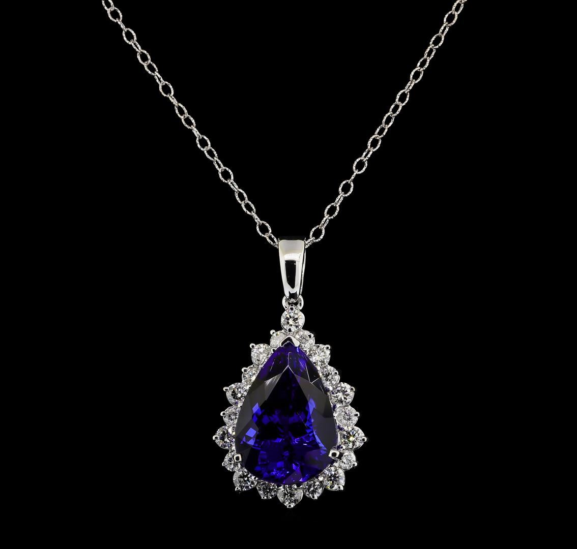 One electronically tested 14KT white gold lady's cast fashion pendant & chain 18.0' long, 1.9mm twisted oval shape link with a lobster claw clasp with a staggered basket halo with a bright polish finish. Identified with markings of '14K'. Condition is new, good workmanship. Containing: One prong set pear modified brilliant cut natural tanzanite, measuring 19.86 x 13.85 x 10.09mm, (depth est.) approximate weight of 16.66ct., clarity is eye clean, dark, strong, violetish blue color, (GIA vB 7/5), cut is very good. Transmitting light with no distortion, transparent. Colored gemstones are presumed to have been subjected to commonly used enhancement processes. Graded loose prior to setting in the GIA Laboratory, Report #5171847879. Ten prong set round brilliant cut diamonds, measuring 3.10 - 3.05 x 1.91mm (depth est.) approximate total weight of 10 Stones = 1.12ct. Graded in the setting. Clarity SI-1 to SI-2. Color: H - I Cut Good Ten prong set round brilliant cut diamonds, measuring 2.60 - 2.55 x 1.60mm (depth est.) approximate total weight of 10 Stones = 0.65ct. Graded in the setting. Clarity SI-1 to I-1. Color: H - I Cut Good. Total Weight of Colored Stones 16.66ct.. Total Weight of Diamonds 1.77ct.. Total Weight of Pendant & Chain 11.10gm. GAS Appraised at $29,290.00.