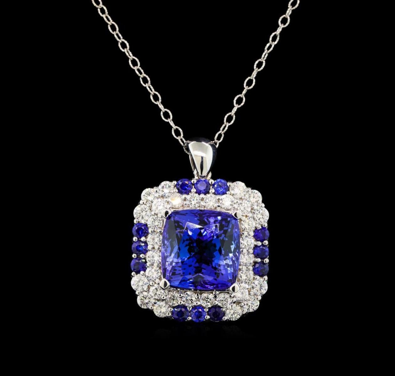 One electronically tested 14KT white gold lady's combination cast & assembled fashion pendant & chain 18.0' long, 2mm twisted oval cable link with a lobster claw clasp with a double basket halo with a bright polish finish. Identified with markings of '14K'. Condition is new, good workmanship. Containing: One prong set square cushion modified brilliant cut natural tanzanite, measuring 13.97 x 13.89 x 10.62mm, (depth est.) 3%. bulge factor, approximate weight of 16.70ct., clarity is eye clean, medium dark, moderately strong, violetish blue color, (GIA vB 6/4), cut is very good. Transmitting light with no distortion, transparent. Colored gemstones are presumed to have been subjected to commonly used enhancement processes. Graded in the setting. Twelve prong set round standard brilliant cut natural blue sapphires, measuring 2.90 - 2.80 x 1.85 mm, (depth est.) approximate total weight of 1.40ct., clarity is eye clean, medium dark, moderately strong, blue color, (GIA B 6/4), cut is good. Transmitting light with no distortion, transparent. Colored gemstones are presumed to have been subjected to commonly used enhancement processes. Graded in the setting. Twelve prong set round brilliant cut diamonds, measuring 3.10 - 3.00 x 1.89mm (depth est.) approximate total weight of 12 Stones = 1.28ct. Graded in the setting. Clarity SI-1 to SI-2. Color: H - I Cut Good Twenty prong set round brilliant cut diamonds, measuring 2.80 - 2.70 x 1.71mm (depth est.) approximate total weight of 20 Stones = 1.60ct. Graded in the setting. Clarity SI-1 to I-1. Color: H - I Cut Good. Total Weight of Colored Stones 18.10ct.. Total Weight of Diamonds 2.88ct.. Total Weight of Pendant & Chain 16.30gm. GAS Appraised.