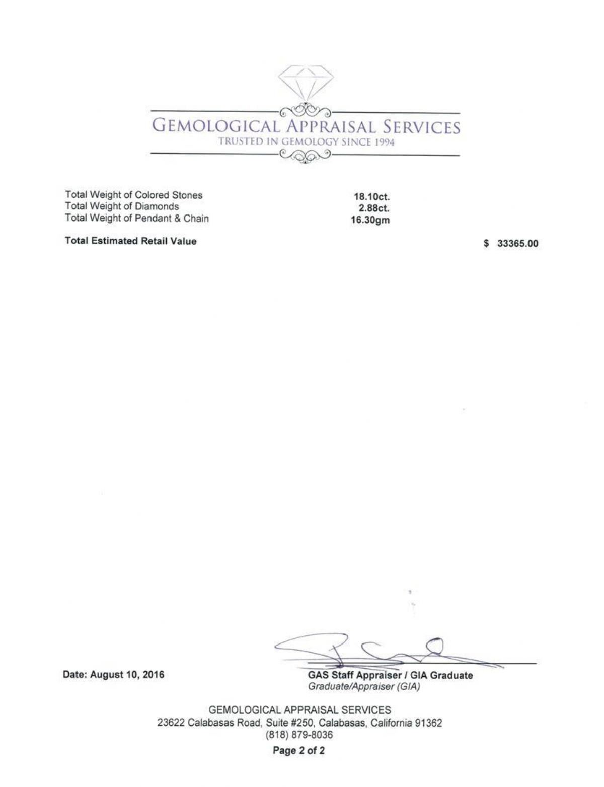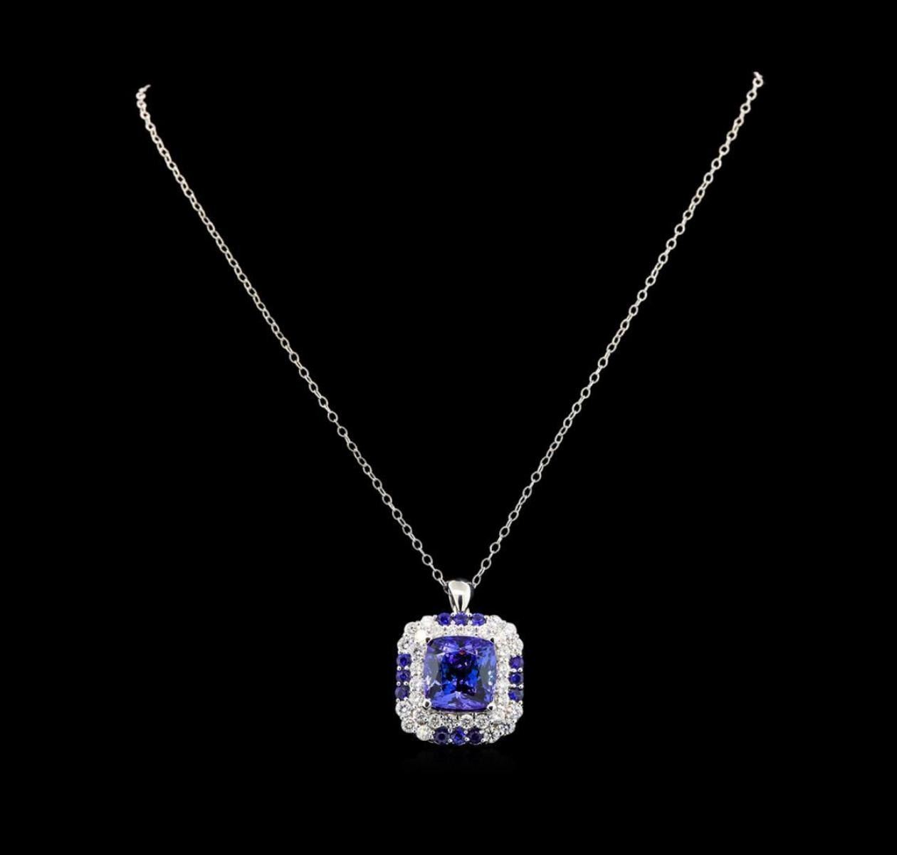 One electronically tested 14KT white gold lady's combination cast & assembled fashion pendant & chain 18.0' long, 2mm twisted oval cable link with a lobster claw clasp with a double basket halo with a bright polish finish. Identified with markings of '14K'. Condition is new, good workmanship. Containing: One prong set square cushion modified brilliant cut natural tanzanite, measuring 13.97 x 13.89 x 10.62mm, (depth est.) 3%. bulge factor, approximate weight of 16.70ct., clarity is eye clean, medium dark, moderately strong, violetish blue color, (GIA vB 6/4), cut is very good. Transmitting light with no distortion, transparent. Colored gemstones are presumed to have been subjected to commonly used enhancement processes. Graded in the setting. Twelve prong set round standard brilliant cut natural blue sapphires, measuring 2.90 - 2.80 x 1.85 mm, (depth est.) approximate total weight of 1.40ct., clarity is eye clean, medium dark, moderately strong, blue color, (GIA B 6/4), cut is good. Transmitting light with no distortion, transparent. Colored gemstones are presumed to have been subjected to commonly used enhancement processes. Graded in the setting. Twelve prong set round brilliant cut diamonds, measuring 3.10 - 3.00 x 1.89mm (depth est.) approximate total weight of 12 Stones = 1.28ct. Graded in the setting. Clarity SI-1 to SI-2. Color: H - I Cut Good Twenty prong set round brilliant cut diamonds, measuring 2.80 - 2.70 x 1.71mm (depth est.) approximate total weight of 20 Stones = 1.60ct. Graded in the setting. Clarity SI-1 to I-1. Color: H - I Cut Good. Total Weight of Colored Stones 18.10ct.. Total Weight of Diamonds 2.88ct.. Total Weight of Pendant & Chain 16.30gm. GAS Appraised.