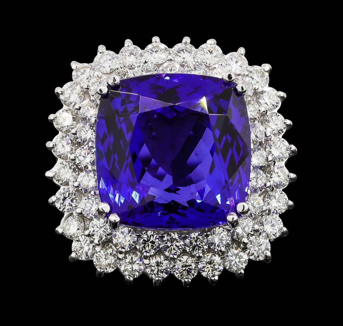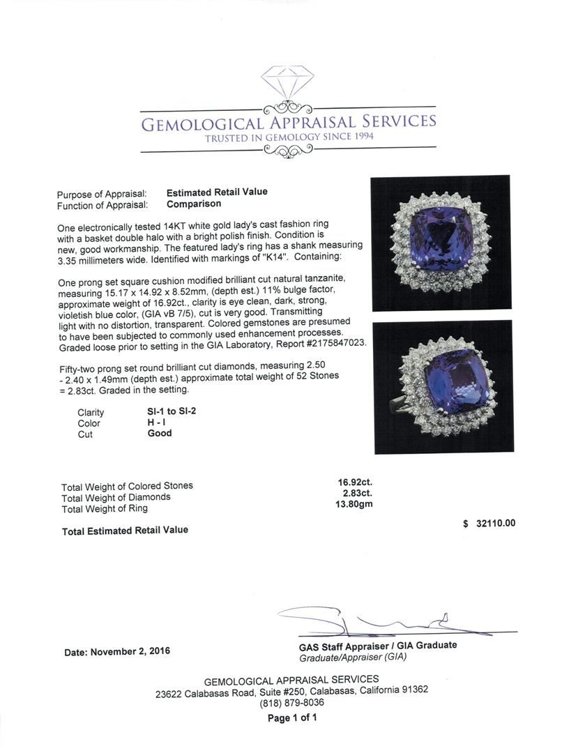 One electronically tested 14KT white gold lady's cast fashion ring with a basket double halo with a bright polish finish. The featured lady's ring has a shank measuring 3.35 millimeters wide. Identified with markings of 'K14'. Condition is new, good workmanship. Containing: One prong set square cushion modified brilliant cut natural tanzanite, measuring 15.17 x 14.92 x 8.52mm, (depth est.) 11%. bulge factor, approximate weight of 16.92ct., clarity is eye clean, dark, strong, violetish blue color, (GIA vB 7/5), cut is very good. Transmitting light with no distortion, transparent. Colored gemstones are presumed to have been subjected to commonly used enhancement processes. Graded loose prior to setting in the GIA Laboratory, Report #2175847023. Fifty-Two prong set round brilliant cut diamonds, measuring 2.50 - 2.40 x 1.49mm (depth est.) approximate total weight of 52 Stones = 2.83ct. Graded in the setting. Clarity SI-1 to SI-2. Color: H - I Cut Good. Total Weight of Colored Stones 16.92ct.. Total Weight of Diamonds 2.83ct.. Total Weight of Ring 13.80gm. GAS Appraised at $32,110.00.