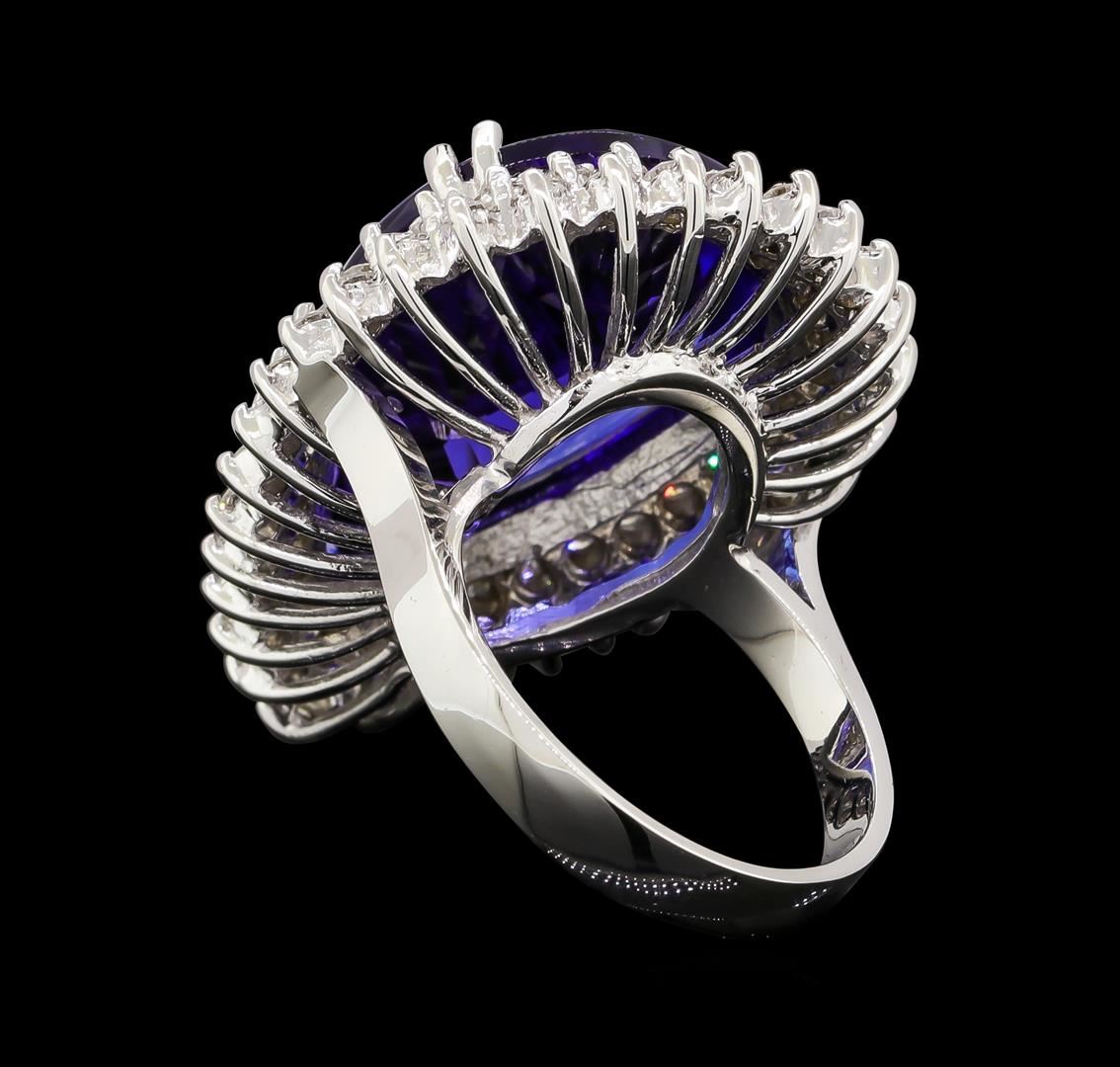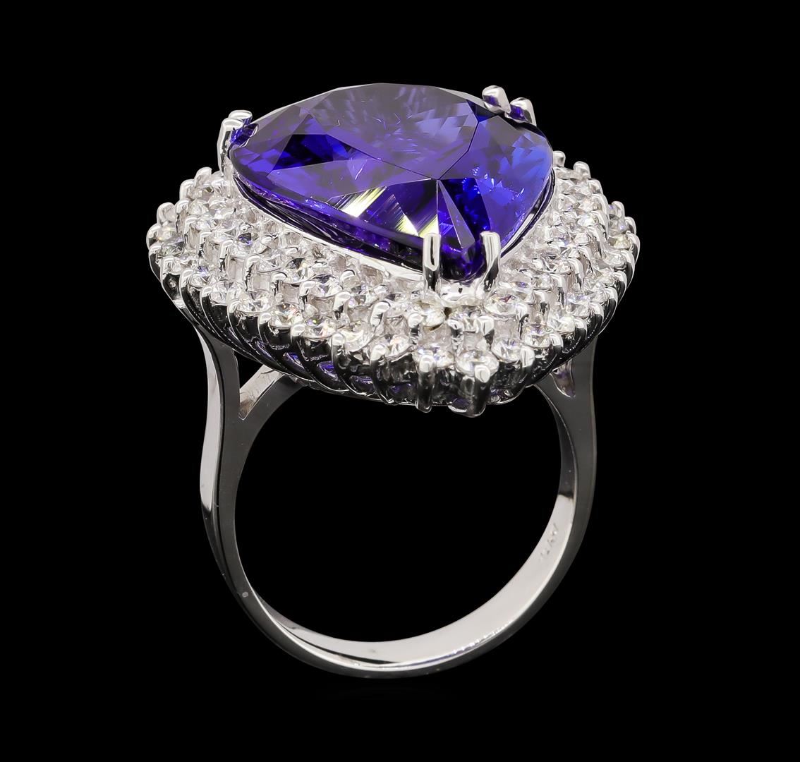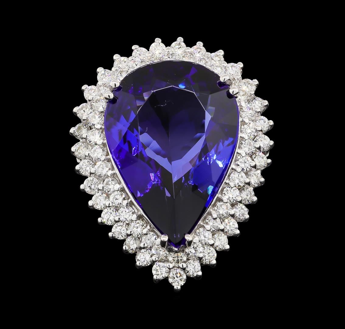 One electronically tested 14KT white gold lady's cast fashion ring with a basket double halo with a bright polish finish. The featured lady's ring has a shank measuring 3.29 millimeters wide. Identified with markings of 'K14'. Condition is new, good workmanship. Containing: One prong set pear modified brilliant cut natural tanzanite, measuring 22.80 x 15.92 x 7.46mm, (depth est.) approximate weight of 17.33ct., clarity is eye clean, dark, moderately strong, violetish blue color, (GIA vB 7/4), cut is very good. Transmitting light with no distortion, transparent. Colored gemstones are presumed to have been subjected to commonly used enhancement processes. Graded loose prior to setting in the GIA Laboratory, Report #2171847544. Sixty-Five prong set round brilliant cut diamonds, measuring 2.10 - 2.00 x 1.27mm (depth est.) approximate total weight of 65 Stones = 2.15ct. Graded in the setting. Clarity SI-1 to I-1. Color: G - H Cut Good. Total Weight of Colored Stones 17.33ct.. Total Weight of Diamonds 2.15ct.. Total Weight of Ring 13.70gm. GAS Appraised at $29,035.00.