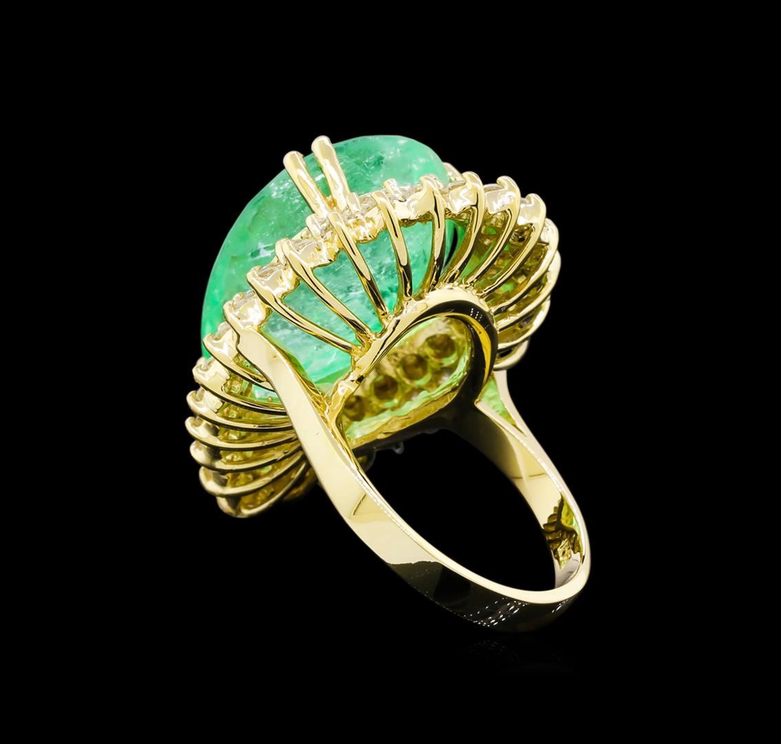 One electronically tested 14KT yellow gold lady's cast fashion ring with a double basket halo with a bright polish finish. The featured lady's ring has a shank measuring 3.03 millimeters wide. Identified with markings of "K14". Condition is new, good workmanship. Containing: One prong set pear modified brilliant cut natural emerald, measuring 21.11 x 15.01 x 10.99mm, exact weight 17.66ct., clarity is moderately included, type III, medium, very slightly grayish, green color, (GIA G 5/3), cut is good. Transmitting light somewhat diffusely, transparent to translucent. Naturally occurring internal & external characteristics are present. Clarity enhanced. Graded loose prior to setting in the GIA Laboratory, Report # 2175501599.Twenty-Seven prong set round brilliant cut diamonds, measuring 2.40 - 2.30 x 1.46mm (depth est.) approximate total weight of 27 Stones = 1.35ct. Graded in the setting. Clarity: SI-1 to SI-2. Color: H - I. Cut Good Twenty-Six prong set round brilliant cut diamonds, measuring 2.00 - 1.95 x 1.23mm (depth est.) approximate total weight of 26 Stones = 0.78ct. Graded in the setting. Clarity: VS to SI-2. Color: H - I. Cut Good. Total Weight of Colored Stones 17.66ct. Total Weight of Diamonds 2.13ct. Total Weight of Ring 13.80gm. GAS Appraised at $32,420.00.