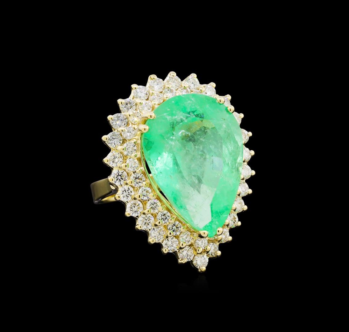 One electronically tested 14KT yellow gold lady's cast fashion ring with a double basket halo with a bright polish finish. The featured lady's ring has a shank measuring 3.03 millimeters wide. Identified with markings of "K14". Condition is new, good workmanship. Containing: One prong set pear modified brilliant cut natural emerald, measuring 21.11 x 15.01 x 10.99mm, exact weight 17.66ct., clarity is moderately included, type III, medium, very slightly grayish, green color, (GIA G 5/3), cut is good. Transmitting light somewhat diffusely, transparent to translucent. Naturally occurring internal & external characteristics are present. Clarity enhanced. Graded loose prior to setting in the GIA Laboratory, Report # 2175501599.Twenty-Seven prong set round brilliant cut diamonds, measuring 2.40 - 2.30 x 1.46mm (depth est.) approximate total weight of 27 Stones = 1.35ct. Graded in the setting. Clarity: SI-1 to SI-2. Color: H - I. Cut Good Twenty-Six prong set round brilliant cut diamonds, measuring 2.00 - 1.95 x 1.23mm (depth est.) approximate total weight of 26 Stones = 0.78ct. Graded in the setting. Clarity: VS to SI-2. Color: H - I. Cut Good. Total Weight of Colored Stones 17.66ct. Total Weight of Diamonds 2.13ct. Total Weight of Ring 13.80gm. GAS Appraised at $32,420.00.